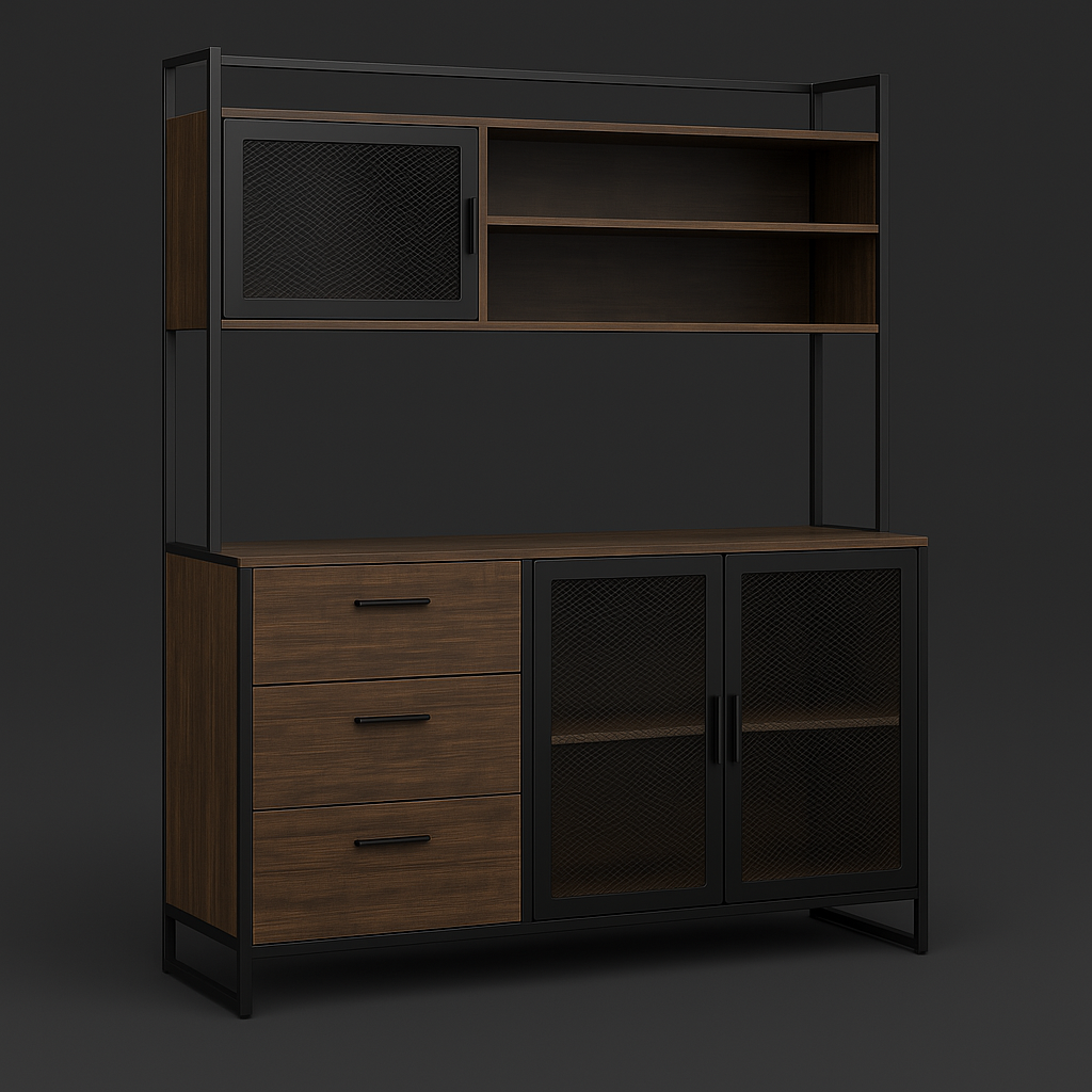 • Ample Storage Space: Includes 6 shelves, 3 drawers, and metal mesh doors.