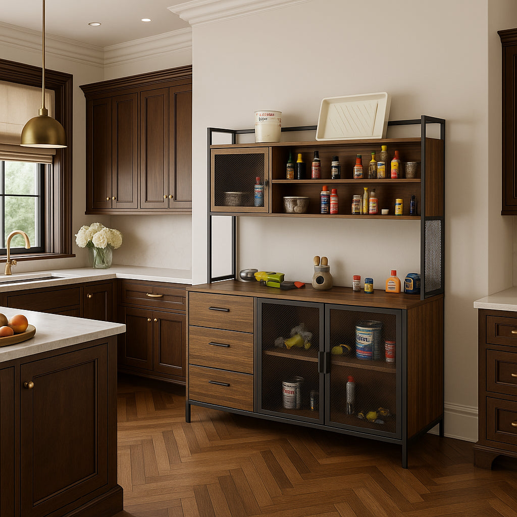 Transform your kitchen space with this beautifully crafted cabinet. The rich brown wood finish and metal mesh doors add a touch of rustic charm, while the multi-layer design ensures functionality and organization. Style it with vintage kitchenware or modern appliances to create a harmonious blend of tradition and contemporary flair. This cabinet is not just a storage solution; it's a statement piece for any home.