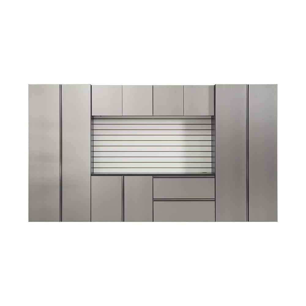 Elevate your garage organization with the Klair Living Nova Series Wall Mounted Storage System. Crafted from eco-friendly E0-grade melamine in a sleek metallic grey finish, this system combines durability with aesthetic appeal. Featuring adjustable components and self-closing mechanisms, it offers robust protection against moisture and environmental elements.