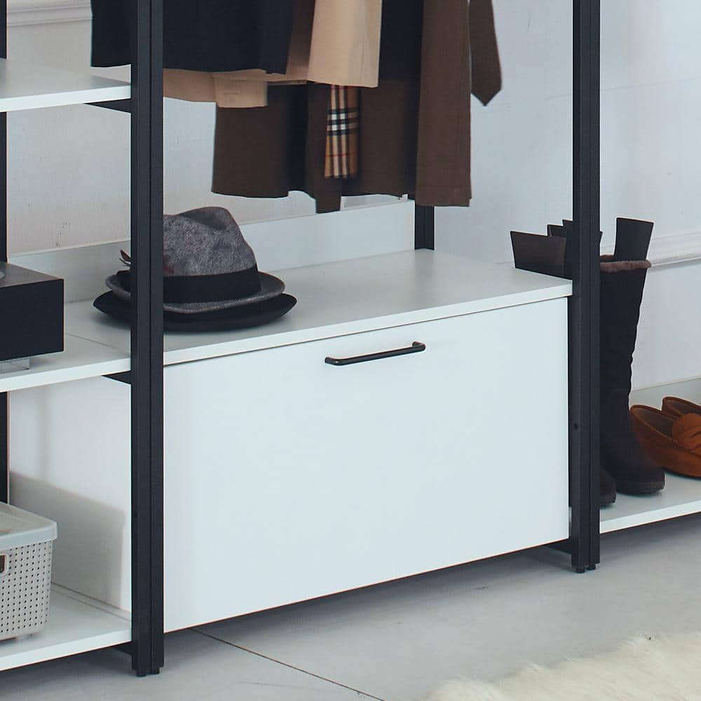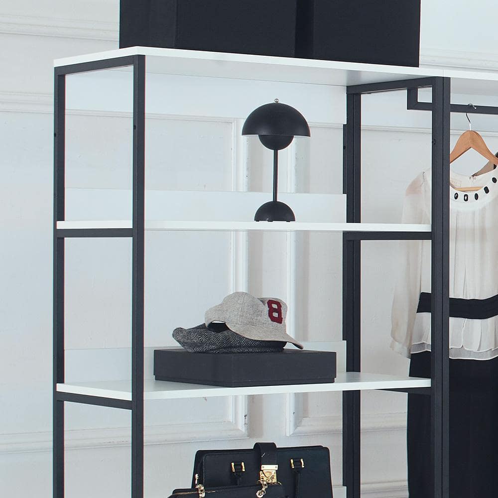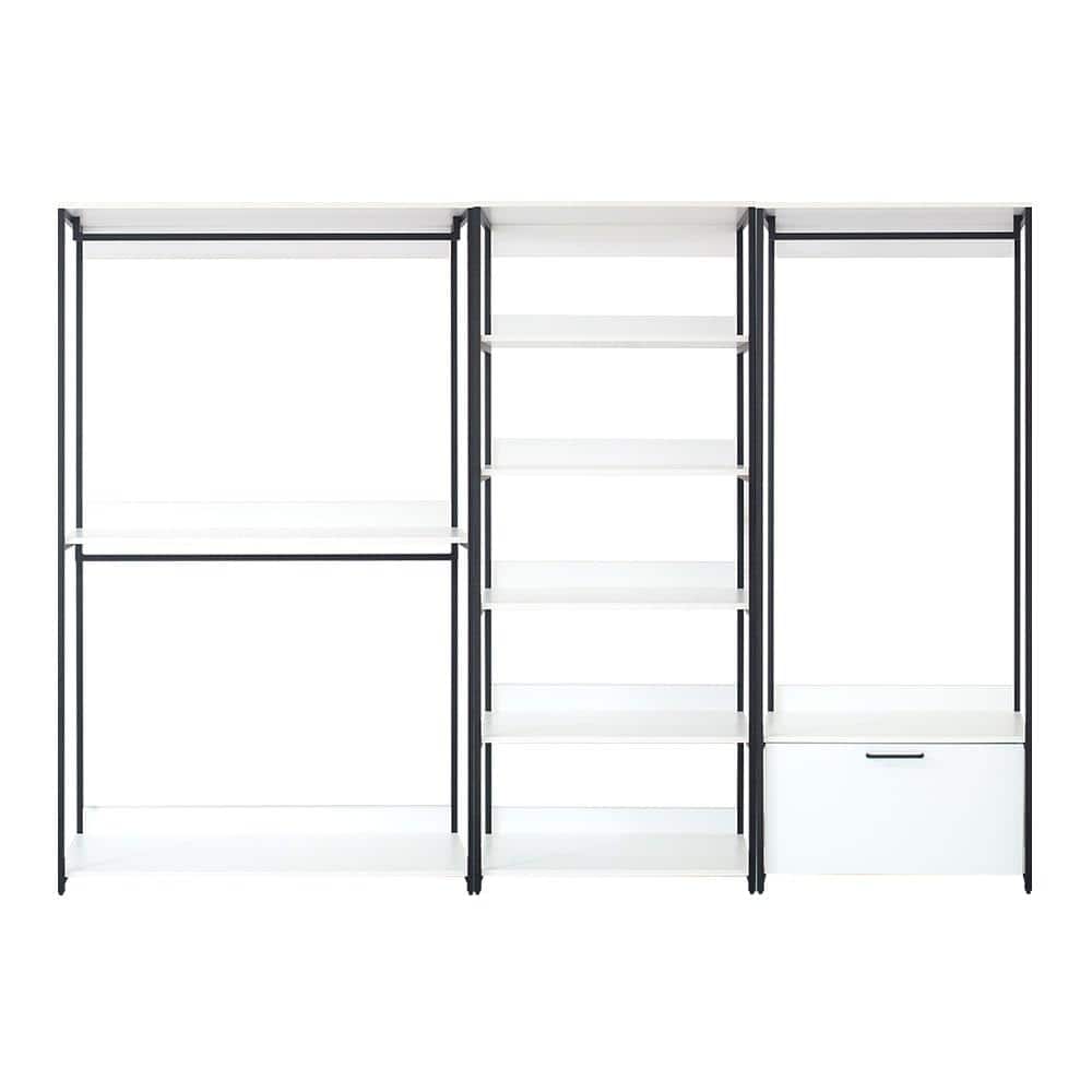Unleash your closet's potential with the Klair Living's Fiona Freestanding Closet System. Designed with wide-reaching modular flexibility, it boasts eco-friendly, durable construction with a chic white wood and black metal finish. Soft-closing drawers and spacious units ensure style and efficiency in organizing your wardrobe.