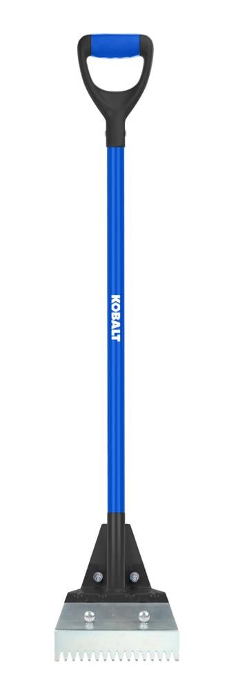 This Kobalt roof shingle remover features a durable 48-in fiberglass handle and a 9-in serrated, replaceable tempered steel blade for fast shingle tear-off. The bi-material rubber D-handle provides comfortable control for heavy-duty roofing jobs.