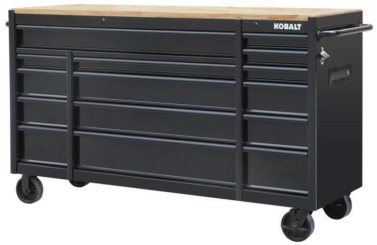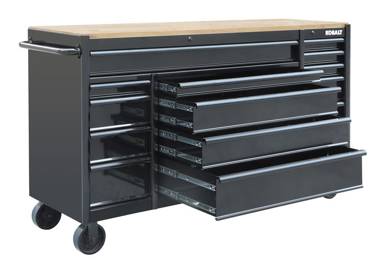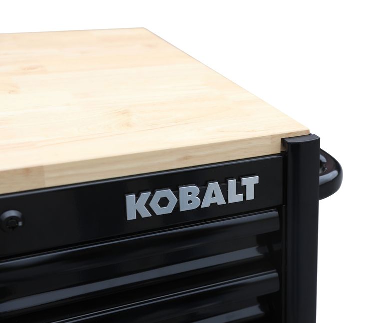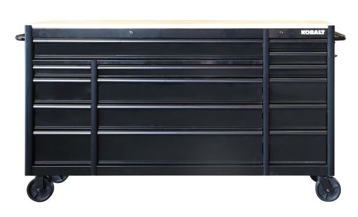 Enjoy ample storage space and convenience with the Kobalt 71-in L x 42.7-in H 15-Drawers Rolling Black Wood Work Bench. With 15 drawers and a spacious worktop, you can easily organize and access your tools and materials. The sturdy wood construction and rolling design make it perfect for any workspace.