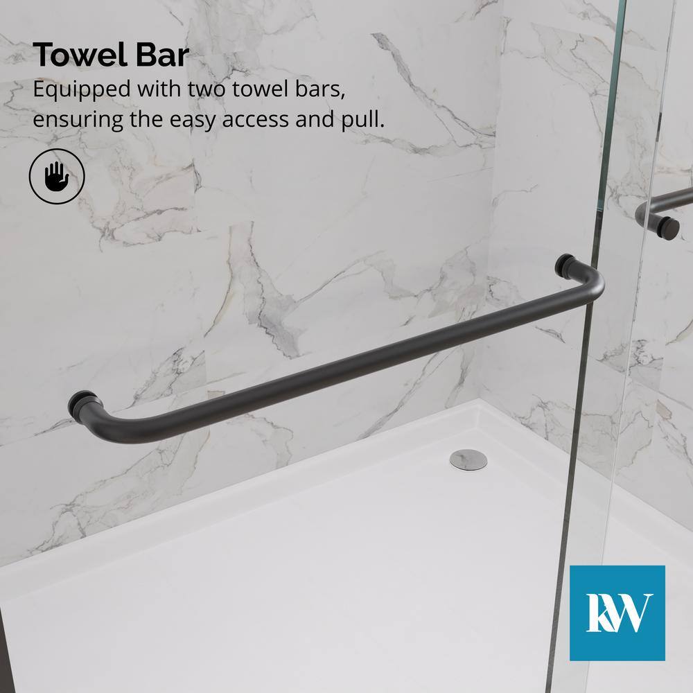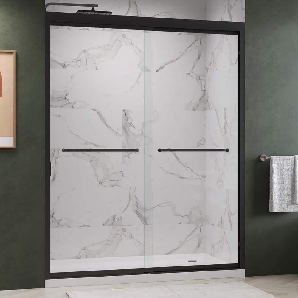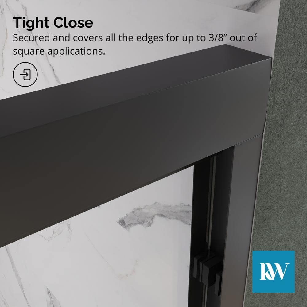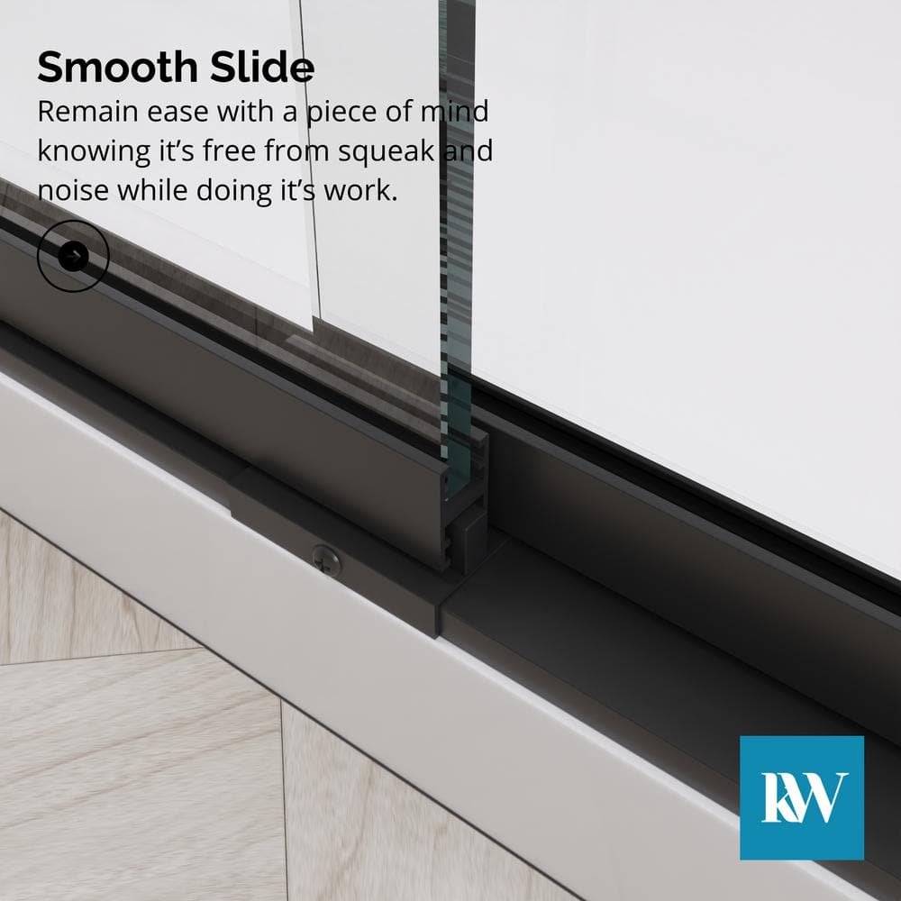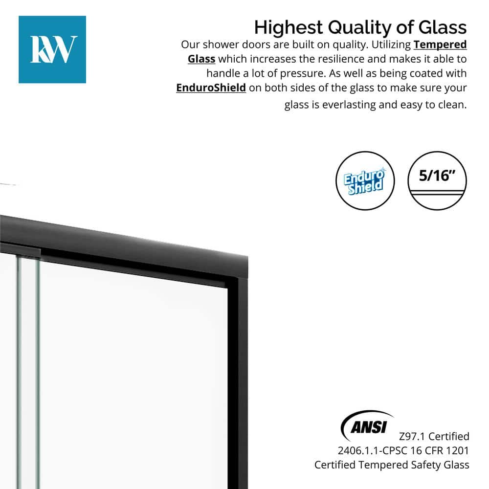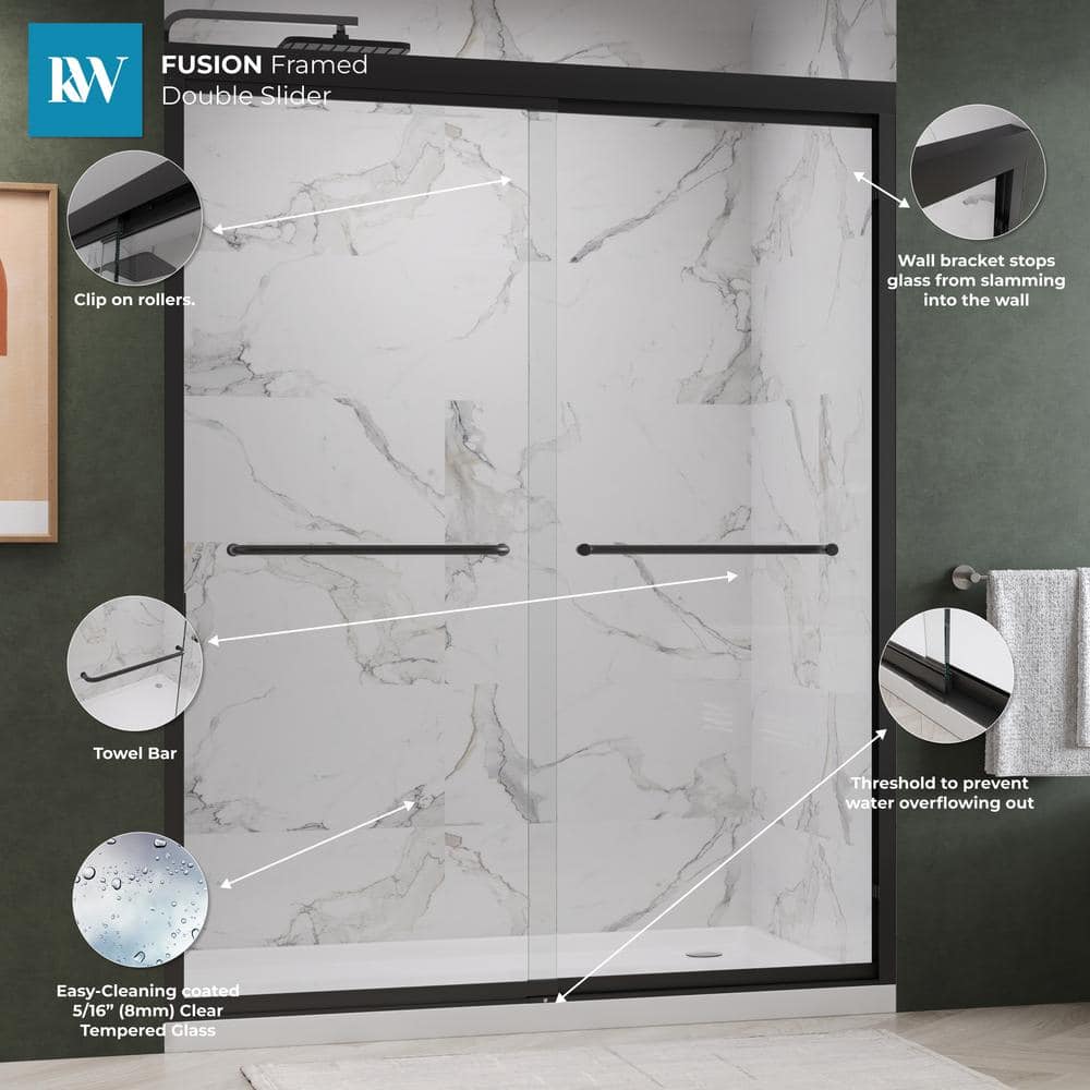 Enhance your bathroom's elegance with the Kobiworks Fusion Double Sliding Shower Door. Featuring 5/16 in. clear tempered glass, this door pairs modern style with functionality. Its matte black frame and smooth-gliding rollers ensure both durability and a seamless shower experience.