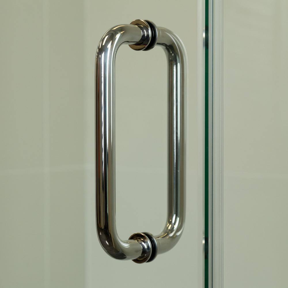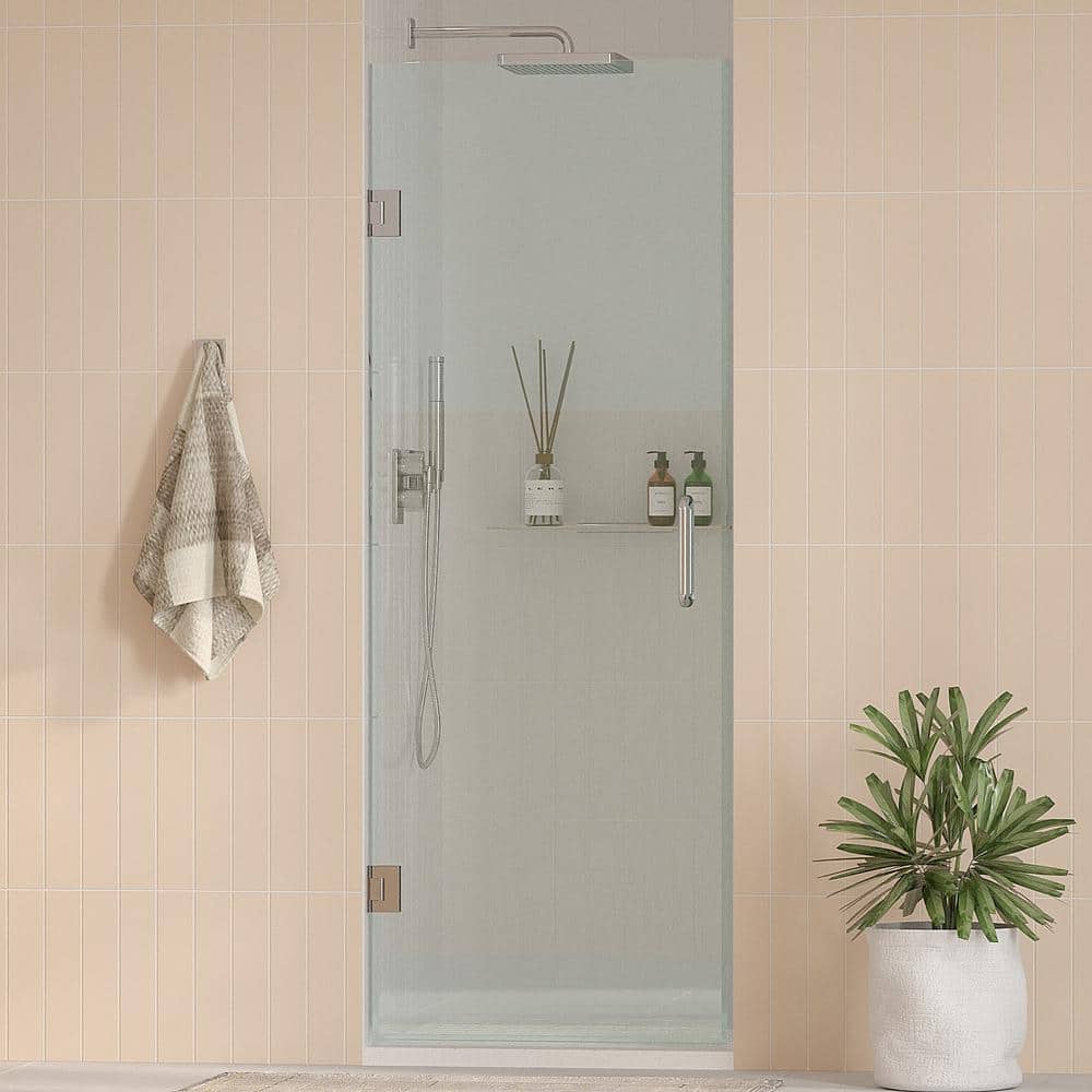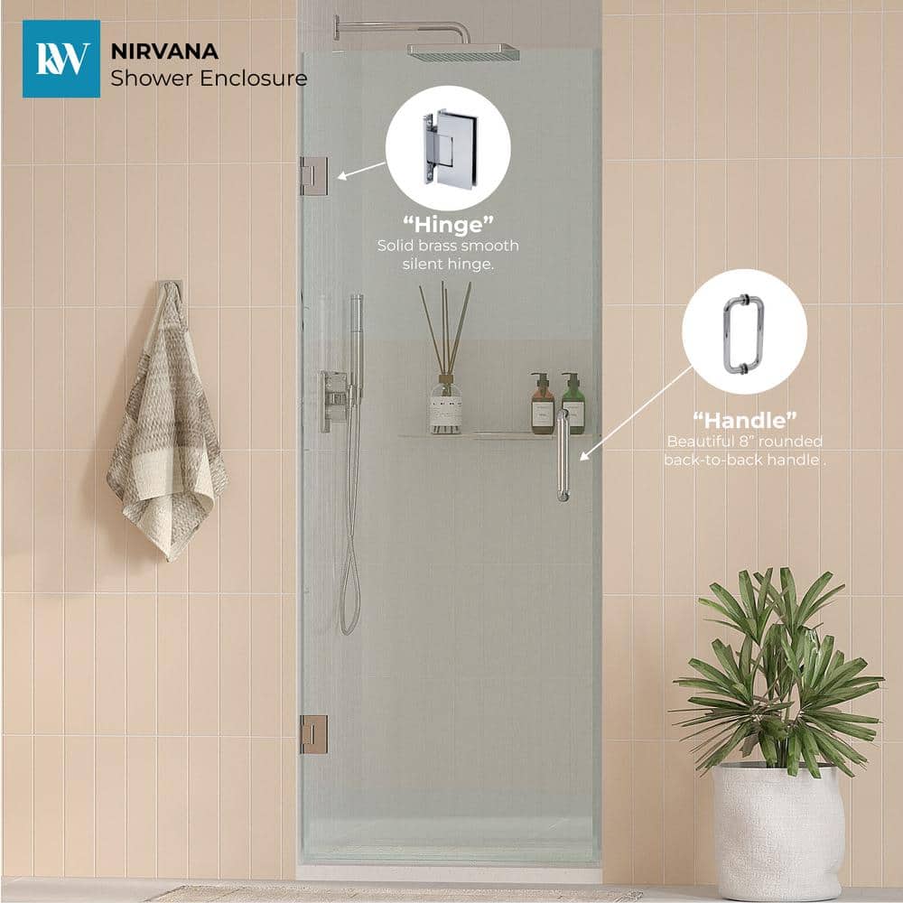 Elevate your bathroom experience with the Kobiworks Nirvana Frameless Hinged Shower Door. This stunning piece features 3/8 inch clear tempered glass, offering both elegance and robust durability. The sleek chrome hardware adds a modern touch, while its frameless design creates an open, airy feel for your shower space.