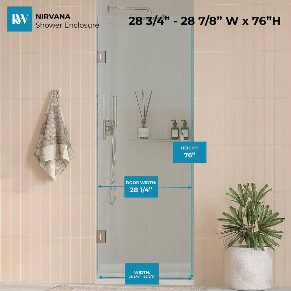 Kobiworks Nirvana 28.75 in. - 27.875 in. W x 76 in. H Frameless Hinged Shower Door in Chrome with 3/8 in. Clear Glass (10 mm)
