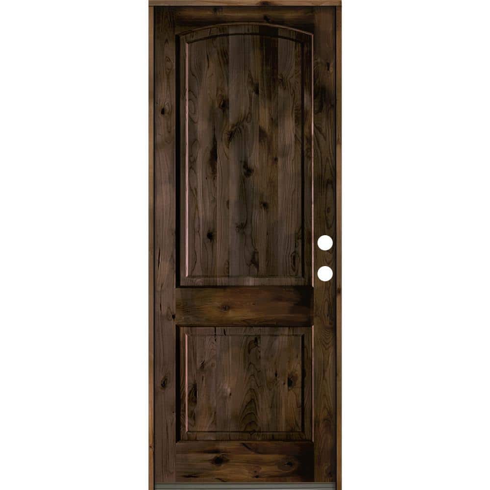 Rustic and durable, this Krosswood Doors prehung front door is crafted from solid Knotty Alder with a rich black stain that highlights natural knots and grain. The 2-panel, left-hand inswing design arrives prehung with bronze hinges, weatherstripping, and threshold for easier installation and long-lasting performance.