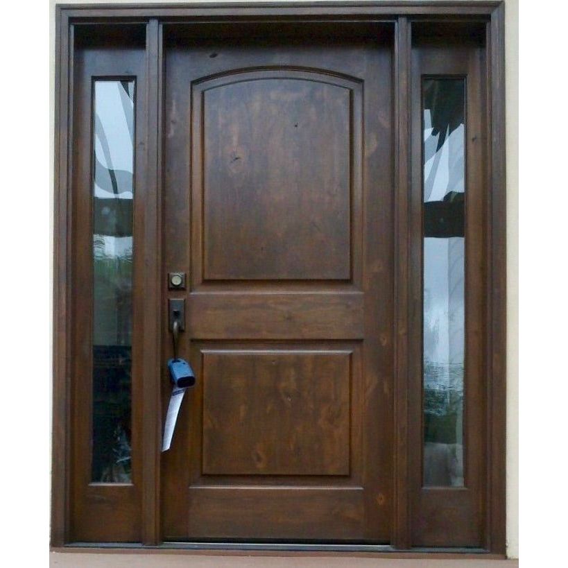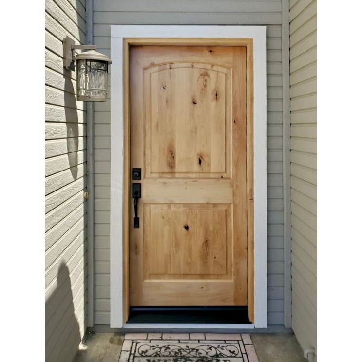 A handcrafted knotty alder wood exterior door with an arch-top 2-panel design, prehung for quick installation. Engineered stiles and rails with laminated alder resist warping, while weather-stripping and an adjustable inswing threshold help seal out drafts.