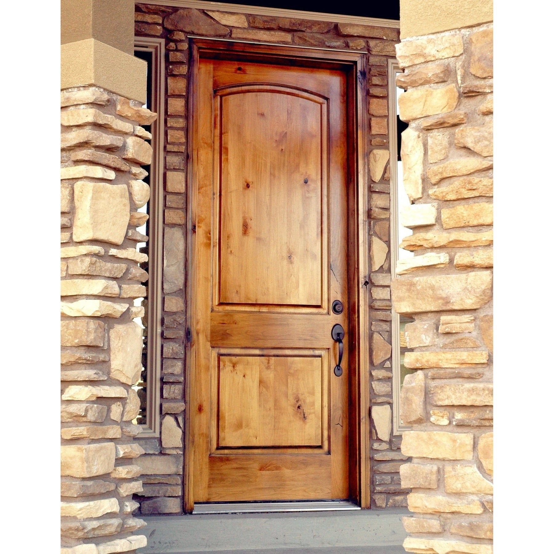 Bring timeless warmth to your entry with this Krosswood Doors prehung front door crafted from rustic knotty alder. The 2-panel arch-top design features engineered stiles/rails for stability, resin-sealed knots, and factory weatherstripping for a tight seal.