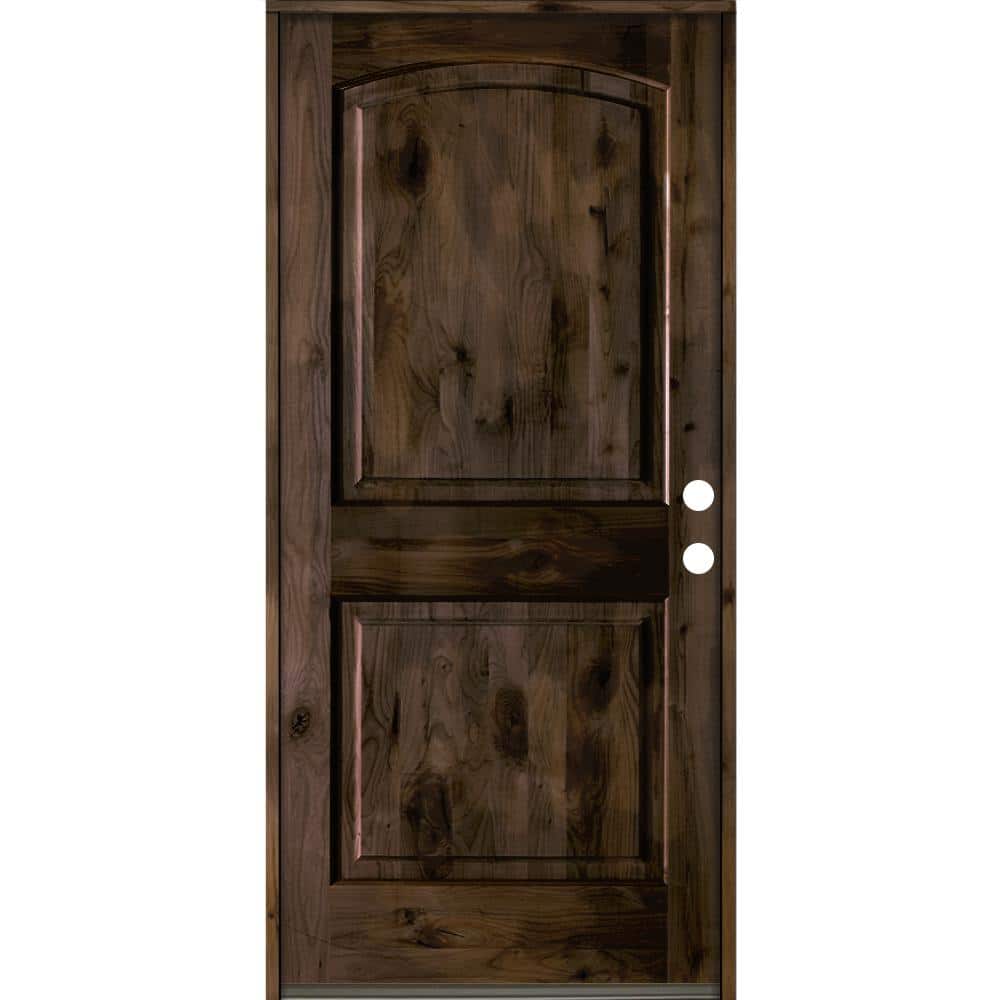 This Krosswood Doors prehung exterior door showcases solid Knotty Alder with a rich black stain that highlights natural knots and grain. Built with a full 1-3/4 in. thick solid panel, bronze hinges, weatherstripping, and threshold, it delivers rustic character with durable performance for your home's entry.