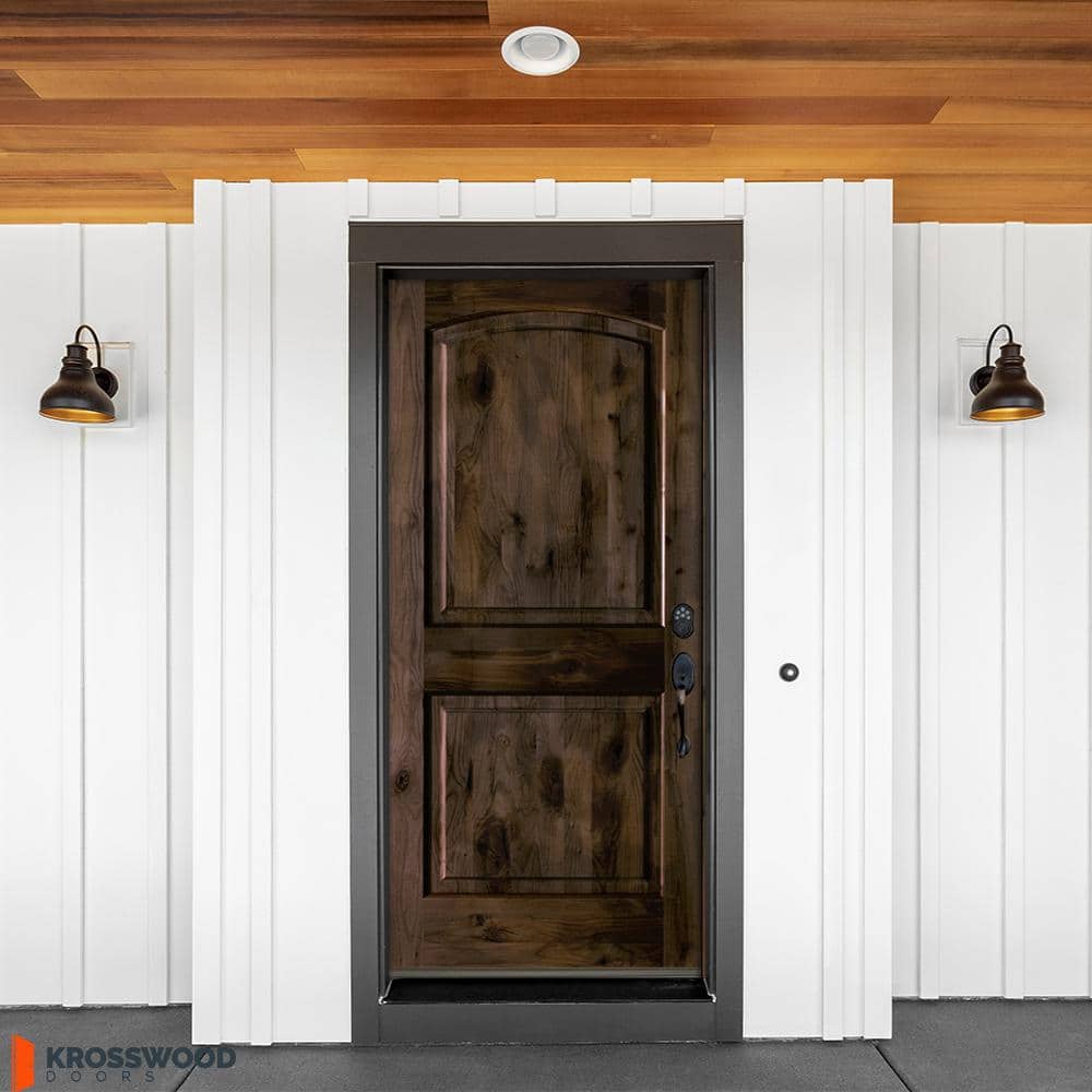This Knotty Alder door brings soulful texture to an entry, its dark stain drawing out the whorls and knots like a bespoke piece of furniture. The arched top panel adds a refined curve that softens a modern farmhouse facade. Frame it with matte bronze hardware and layered planters for a chic welcome. It’s a foundational element for a home that feels effortlessly luxurious and timeless.