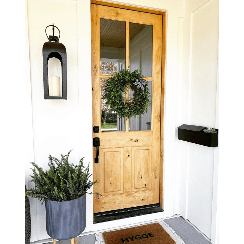 This knotty alder beauty ushers in daylight with four crystalline panes while its expressive grain and knots ground the entry in organic warmth. I adore the balanced composition—airy glass above, sculpted panels below—for a timeless farmhouse silhouette. Pair it with matte black hardware and layered natural textiles on the porch for effortless charm. It’s the kind of statement door that makes every arrival feel luxuriously considered.