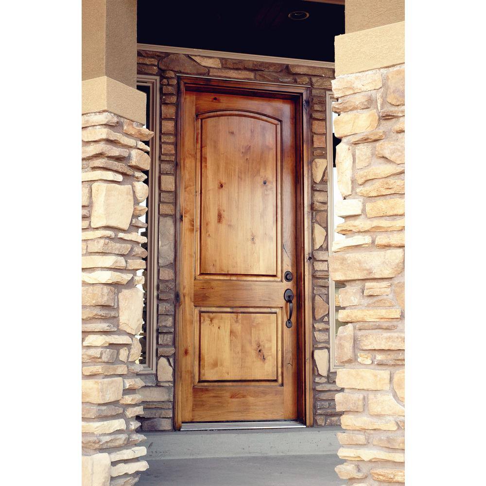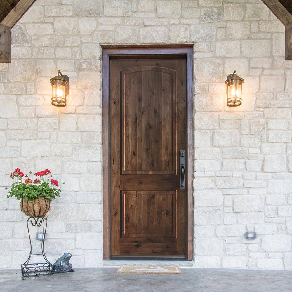 This Knotty Alder front door brings a handsome, moody richness to the entry, with dark knots and grain that feel authentically handcrafted. The arched top panel offers a soft architectural gesture that elevates traditional and farmhouse facades alike. Style it with patinated bronze hardware and lantern lighting for a layered, welcoming look. A timeless statement piece that signals refined, luxurious living from the very first impression.