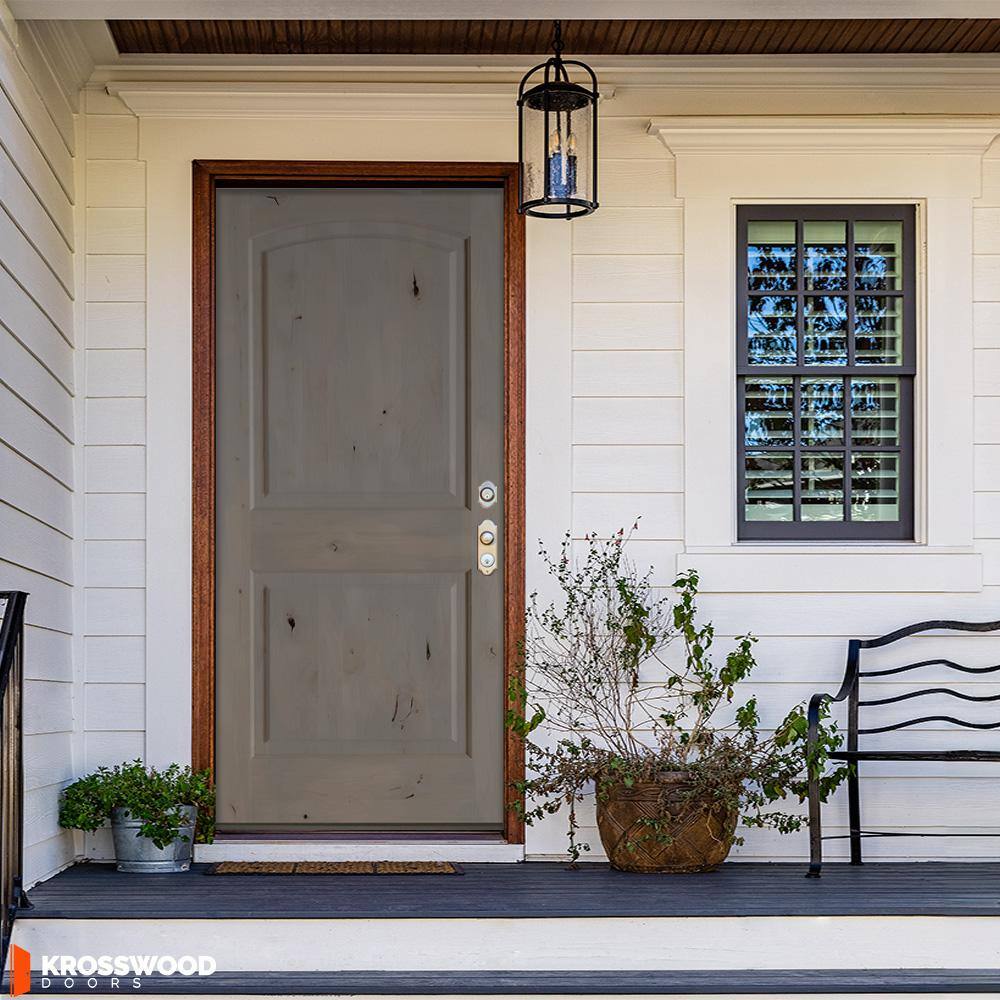 A solid Knotty Alder prehung exterior door with rich grey stain and classic 2-panel styling. Built with doweled, full-thickness construction, bronze hinges, and weatherstripping for durability and a tight seal—ready to elevate your entryway.