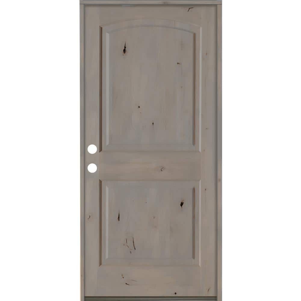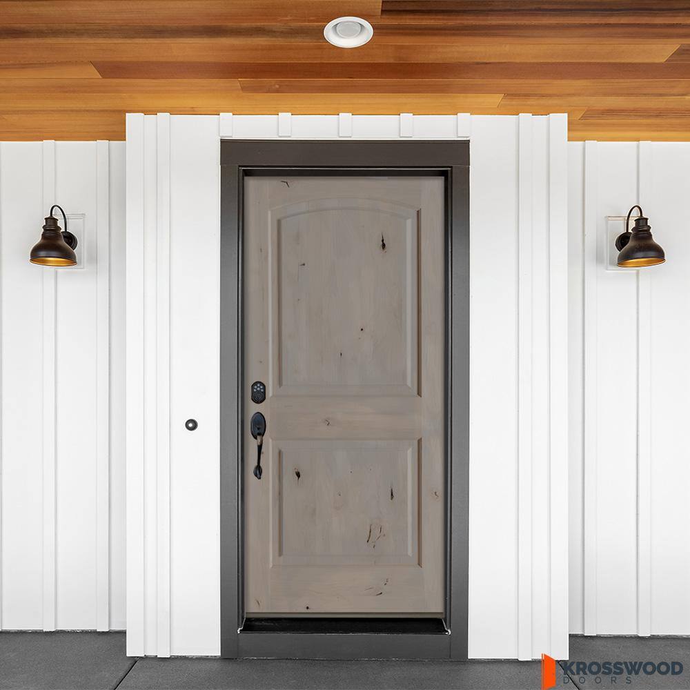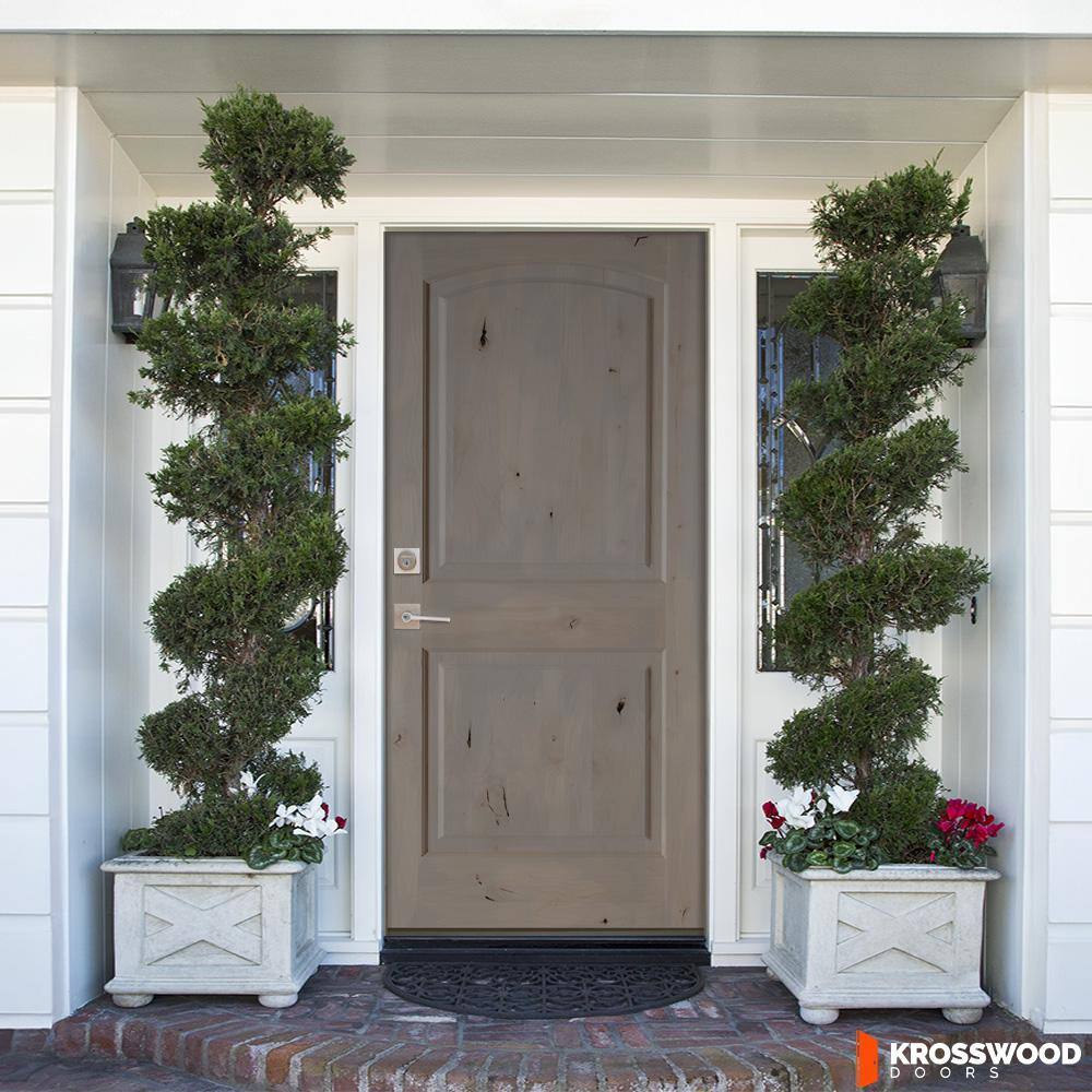 This prehung front door by Krosswood Doors features solid Knotty Alder construction with a rich grey stain that highlights natural knots and grain. Built for durability with a full 1-3/4 in. thick slab, bronze hinges, weatherstripping, and an inswing threshold, it arrives ready to install for an inviting, rustic entry.