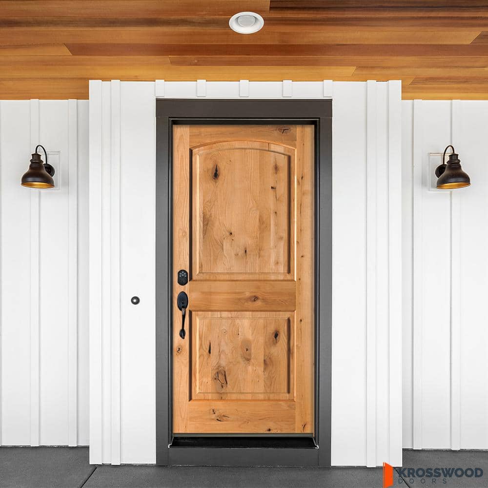 Bring timeless warmth to your entry with this Krosswood Doors prehung front door, crafted from solid knotty alder with an arched 2-panel design and clear stain. Factory prehung with weatherstripping, bronze hinges, and threshold, it’s built for durability and easy installation under a proper overhang.