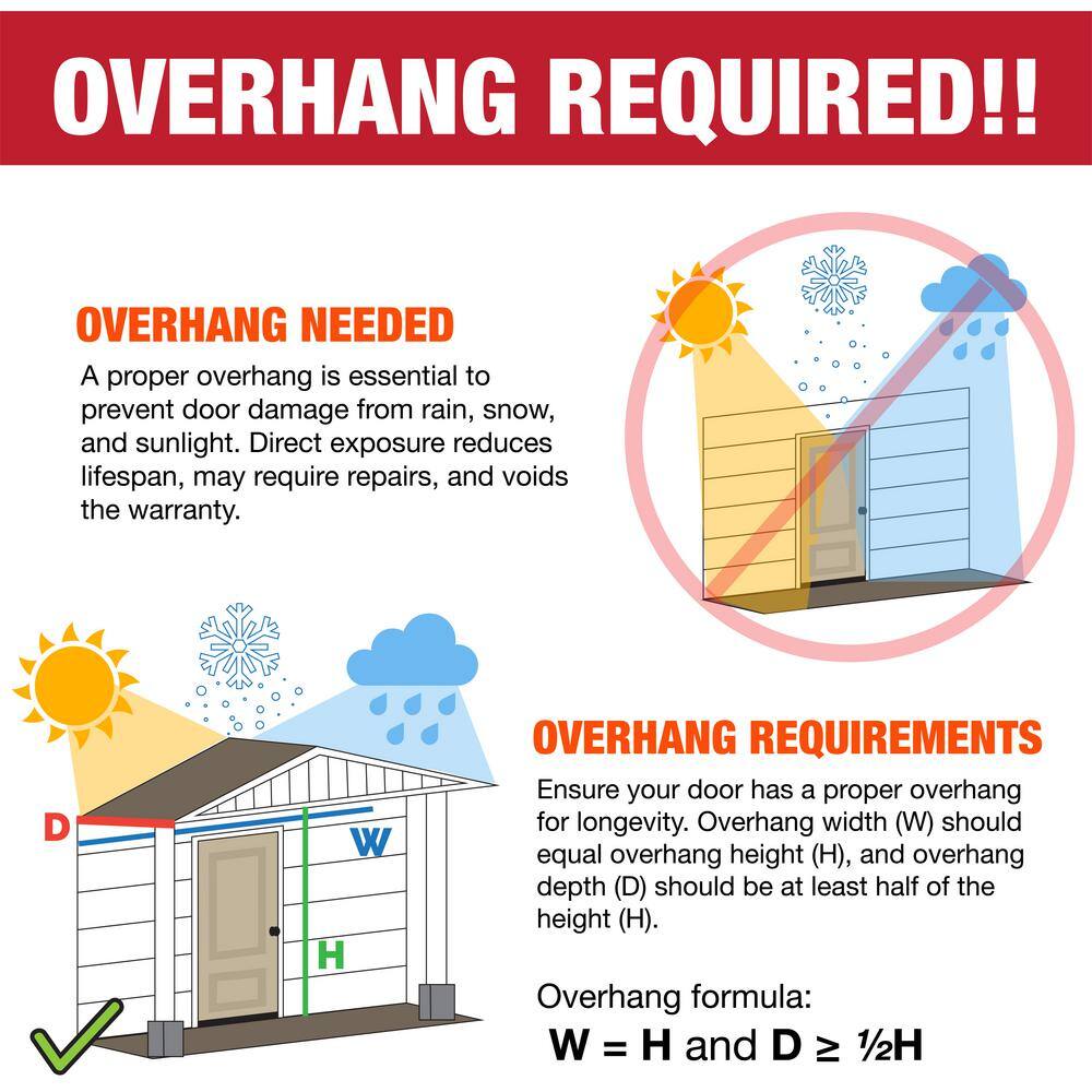 A: An adequate overhang is required to protect the door and maintain the warranty.