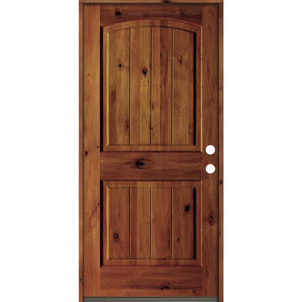 A handcrafted rustic front door made from knotty alder with an arch-top, V-grooved panels, and a warm red chestnut stain. Prehung with matching wood jambs, bronze hinges, and weatherstripping for easier installation and better sealing.
