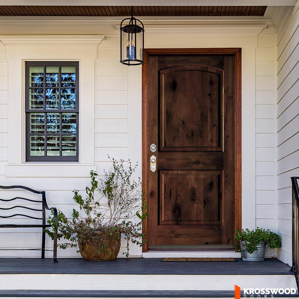 This Krosswood Doors prehung exterior door features solid Knotty Alder with an arch-top 2-panel design finished in Red Mahogany stain. Built with a full 1-3/4 in. thick slab, matching wood jamb, bronze hinges, and weatherstripping for a durable, ready-to-install front entry.