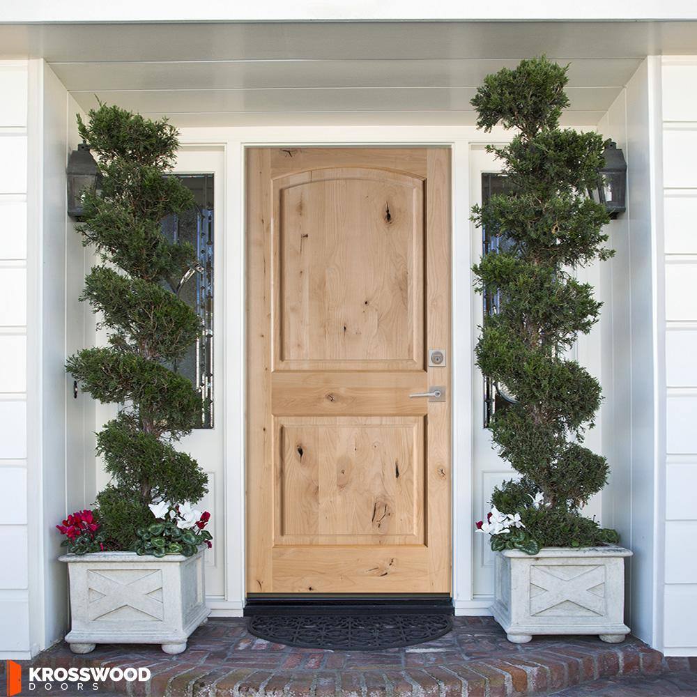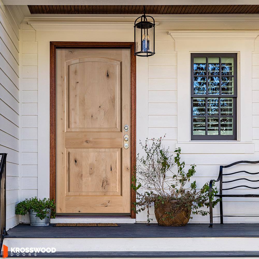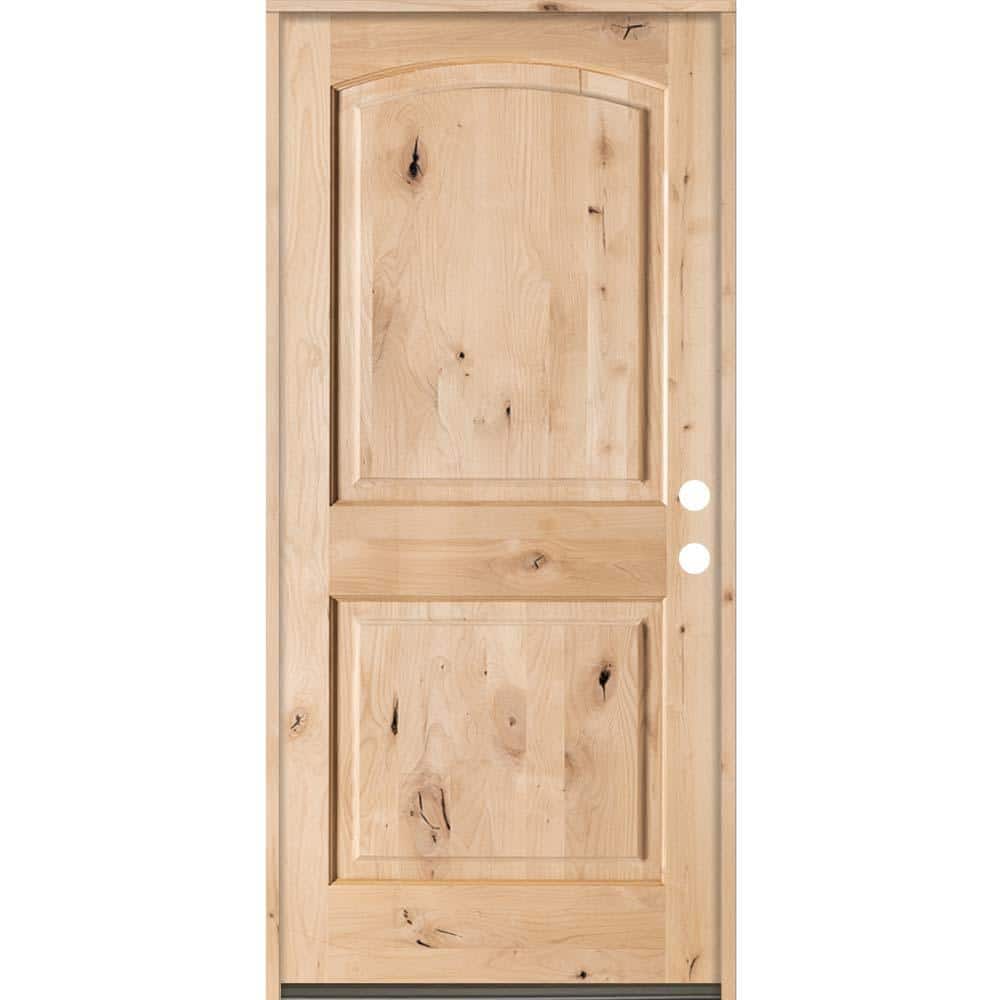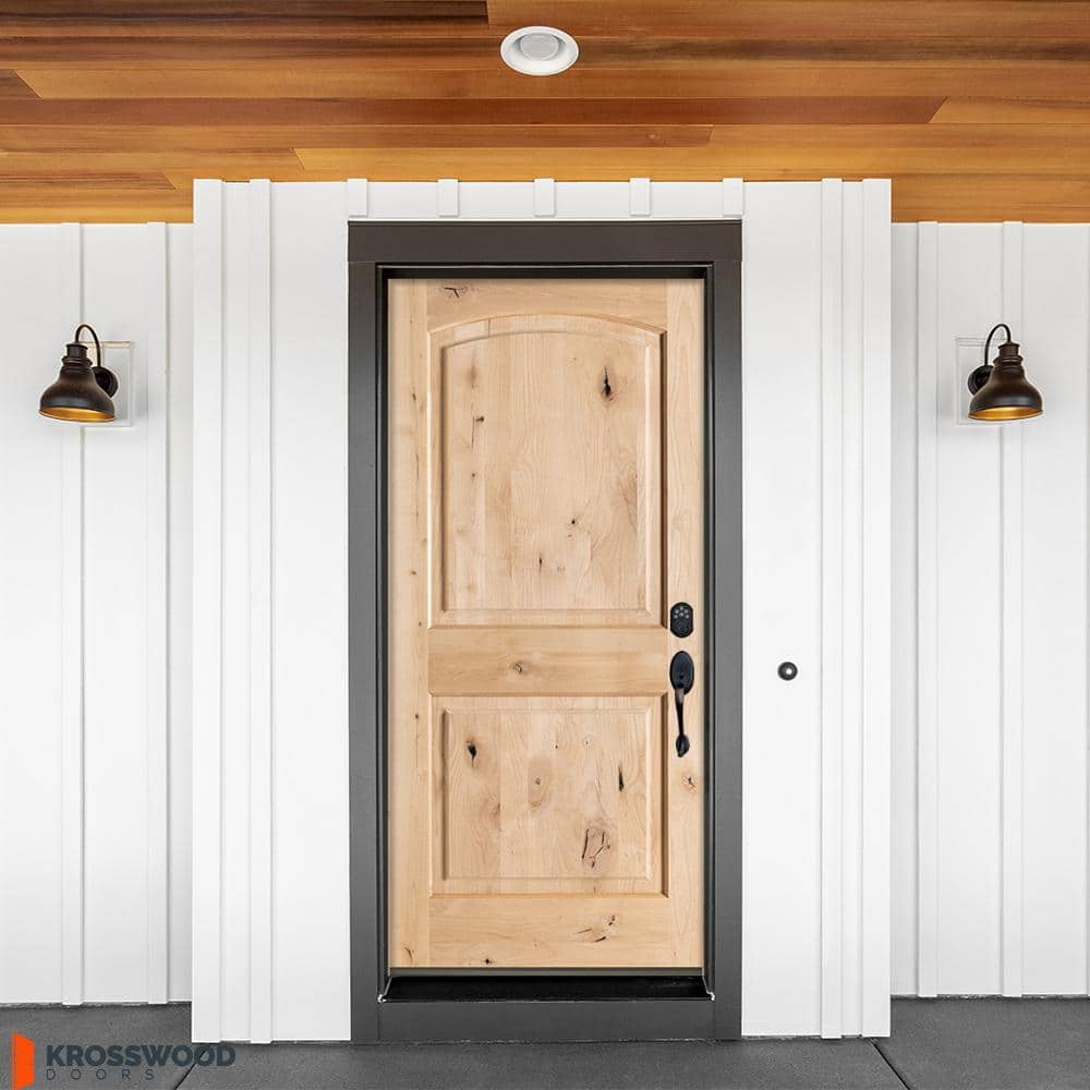 This Krosswood Doors prehung exterior front door features a rustic 2-panel top-rail arch design crafted from solid Knotty Alder. Supplied unfinished for custom staining, it includes double-bore prep, bronze hinges, threshold, jamb, and high-performance weatherstripping for a durable, ready-to-install entry solution.