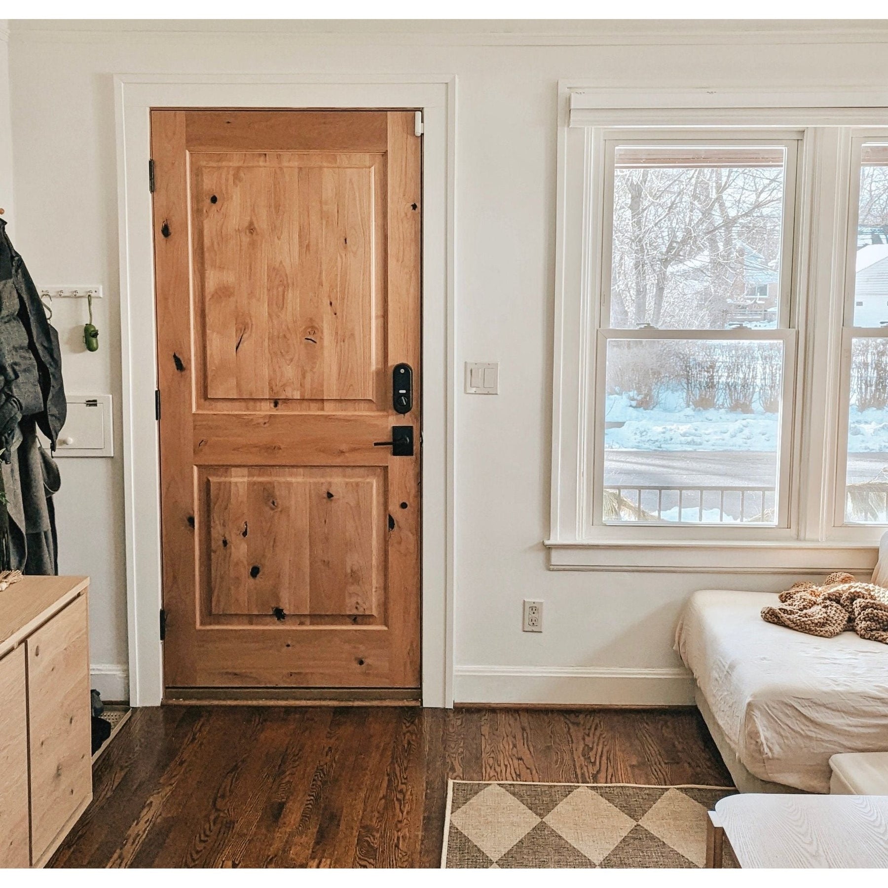 This Knotty Alder door brings an organic, hand-hewn elegance that instantly grounds an entry with texture and warmth. I love the square-top, two-panel profile—classic proportions that feel timeless yet modern. Pair it with matte black hardware and a woven runner to amplify its natural grain and rich knots. It’s a statement piece that elevates everyday living with effortless luxury.