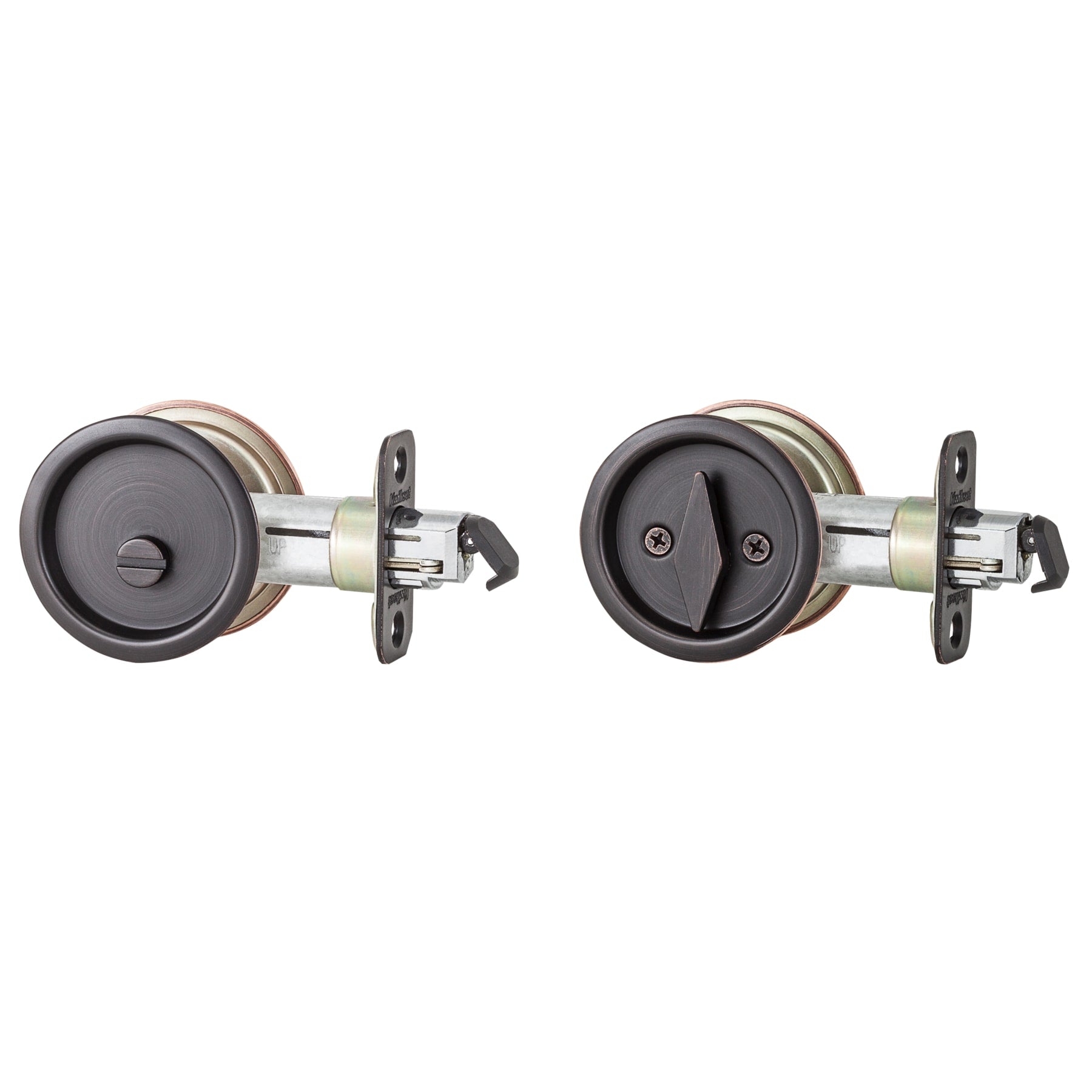 A round, 2.03-inch privacy pocket door pull from Kwikset, finished in rich Venetian bronze. Designed to fit a standard 2-1/8-inch drilled door for quick, screwdriver-only installation and dependable everyday use.