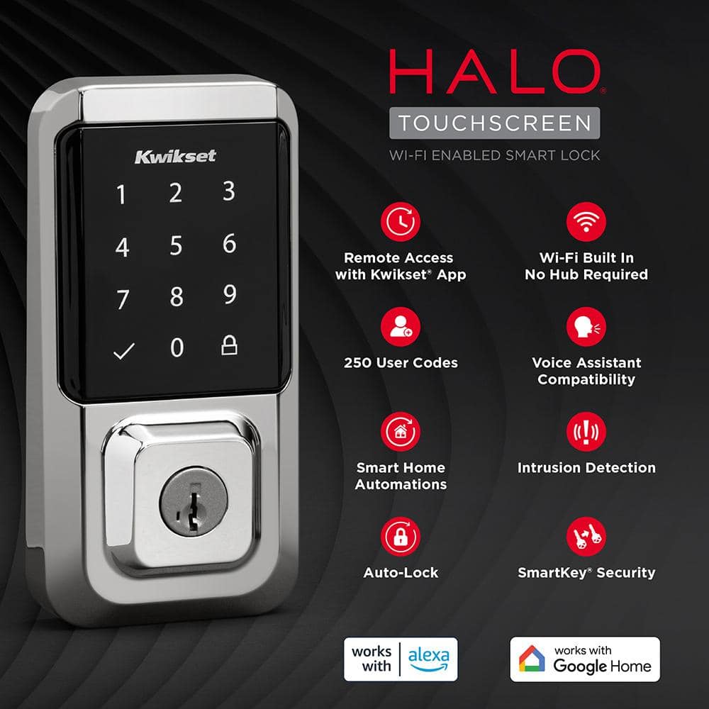 Enhance your home security with the Kwikset HALO Wi-Fi Smart Lock. This polished chrome deadbolt offers keyless entry with both touchscreen and app control, allowing you to manage your lock from anywhere without a hub. Featuring the reliable SmartKey Security, this smart lock combines modern design with advanced technology for unrivaled convenience and peace of mind.
