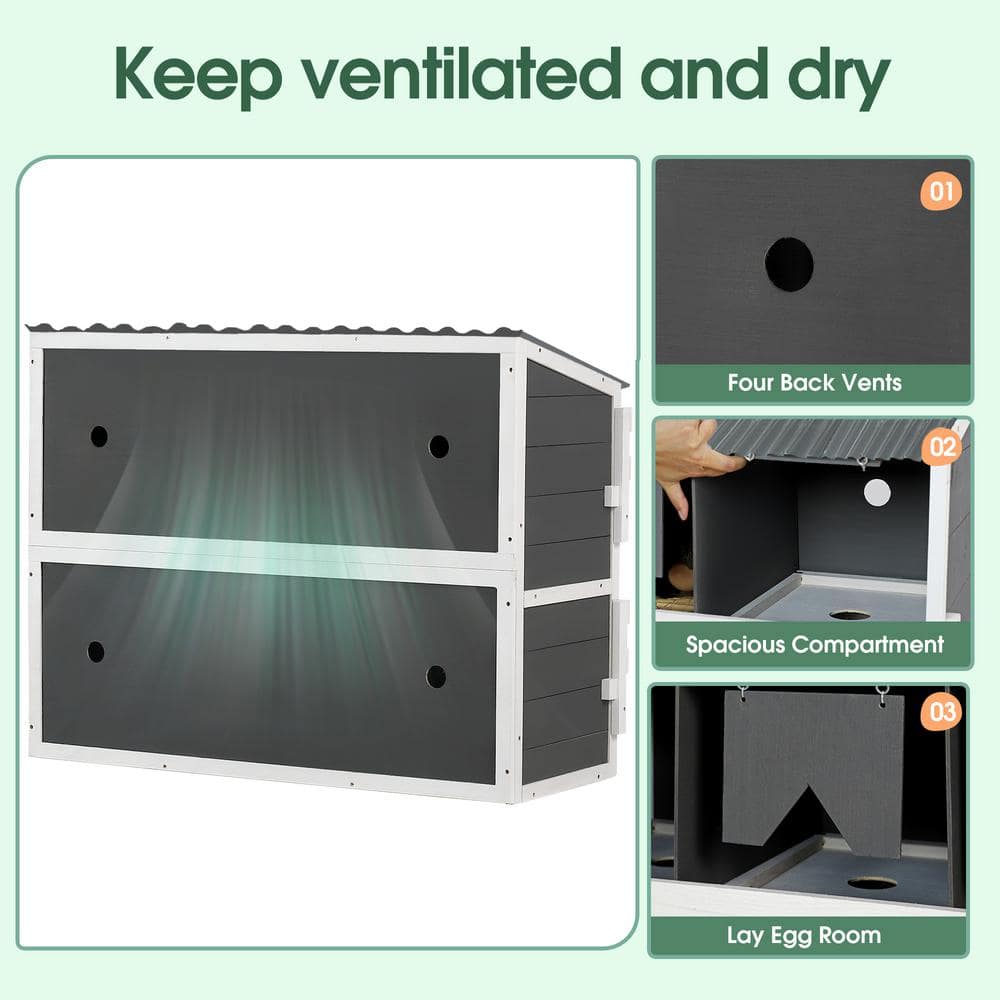 Q: Can the nesting box be used in various weather conditions? A: Yes, the slanted roof design prevents water accumulation, making it suitable for use in rainy conditions while maintaining dryness and comfort for the hens.