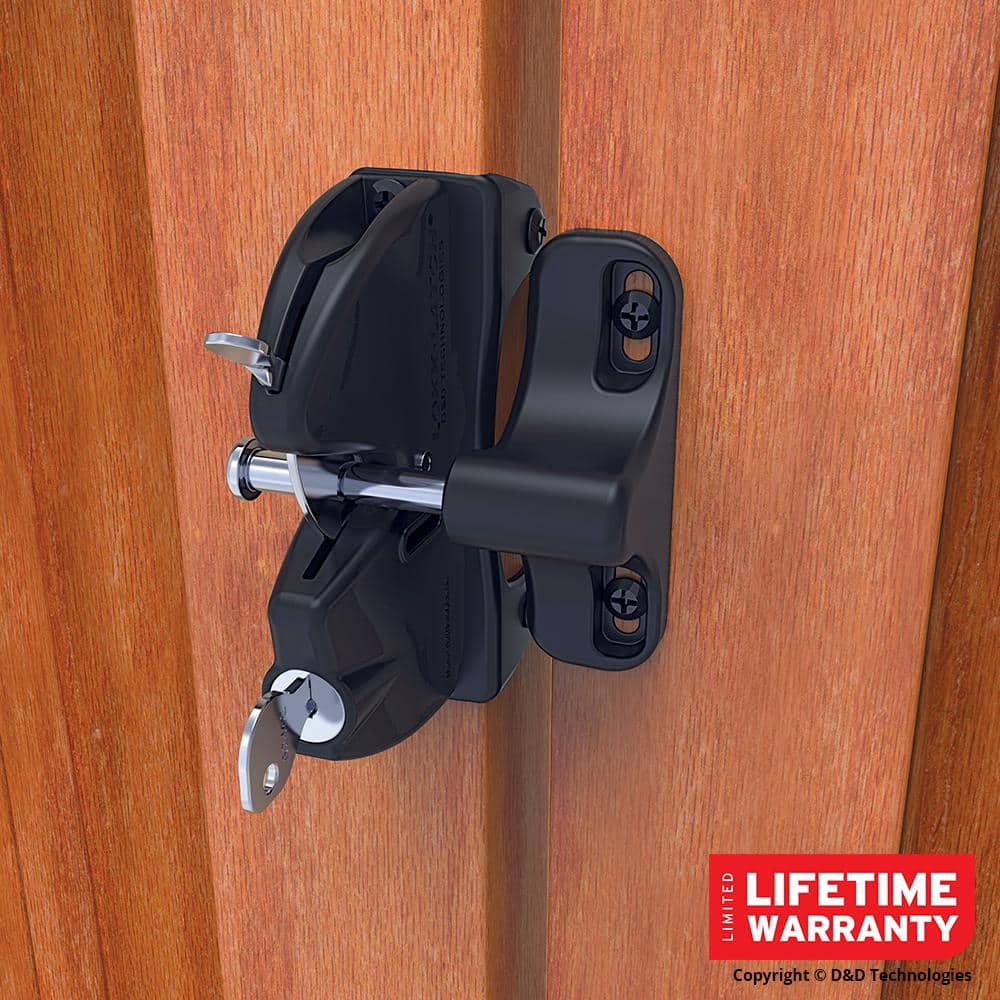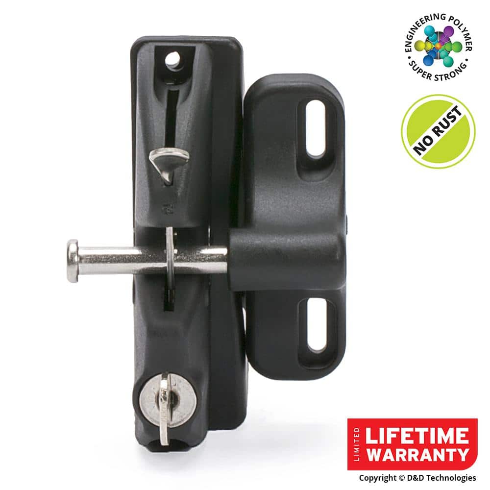 The LOKKLATCH D&D Black Key-Lockable Gate Latch combines industrial strength with sophisticated design for unparalleled security and ease of use. Constructed from marine grade stainless steel and super-strong polymer, it resists rust and adjusts for both vertical and horizontal installation. Ideal for metal, wood, and vinyl gates.