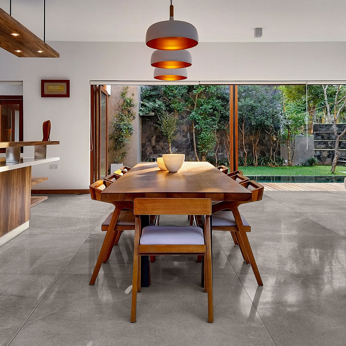 The New Rock Fossil Dark Gray Matte Porcelain Tile offers a sophisticated limestone look with a durable porcelain construction. Its large 48x48 format and matte finish make it ideal for modern interiors and exteriors.