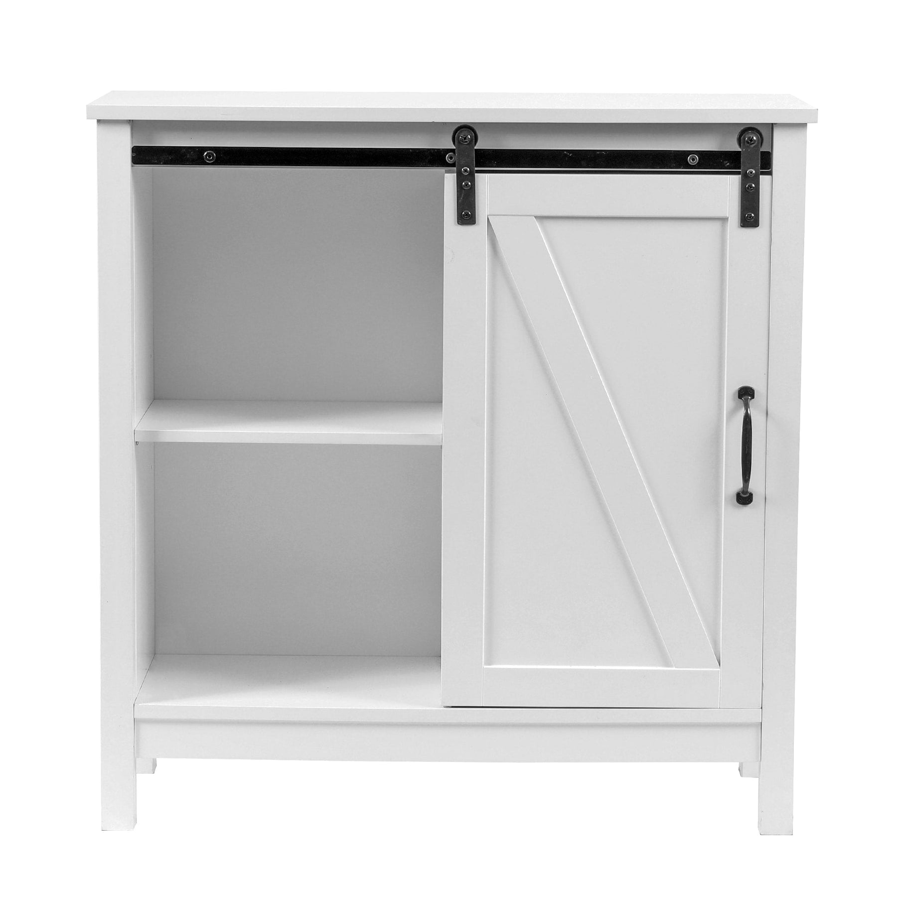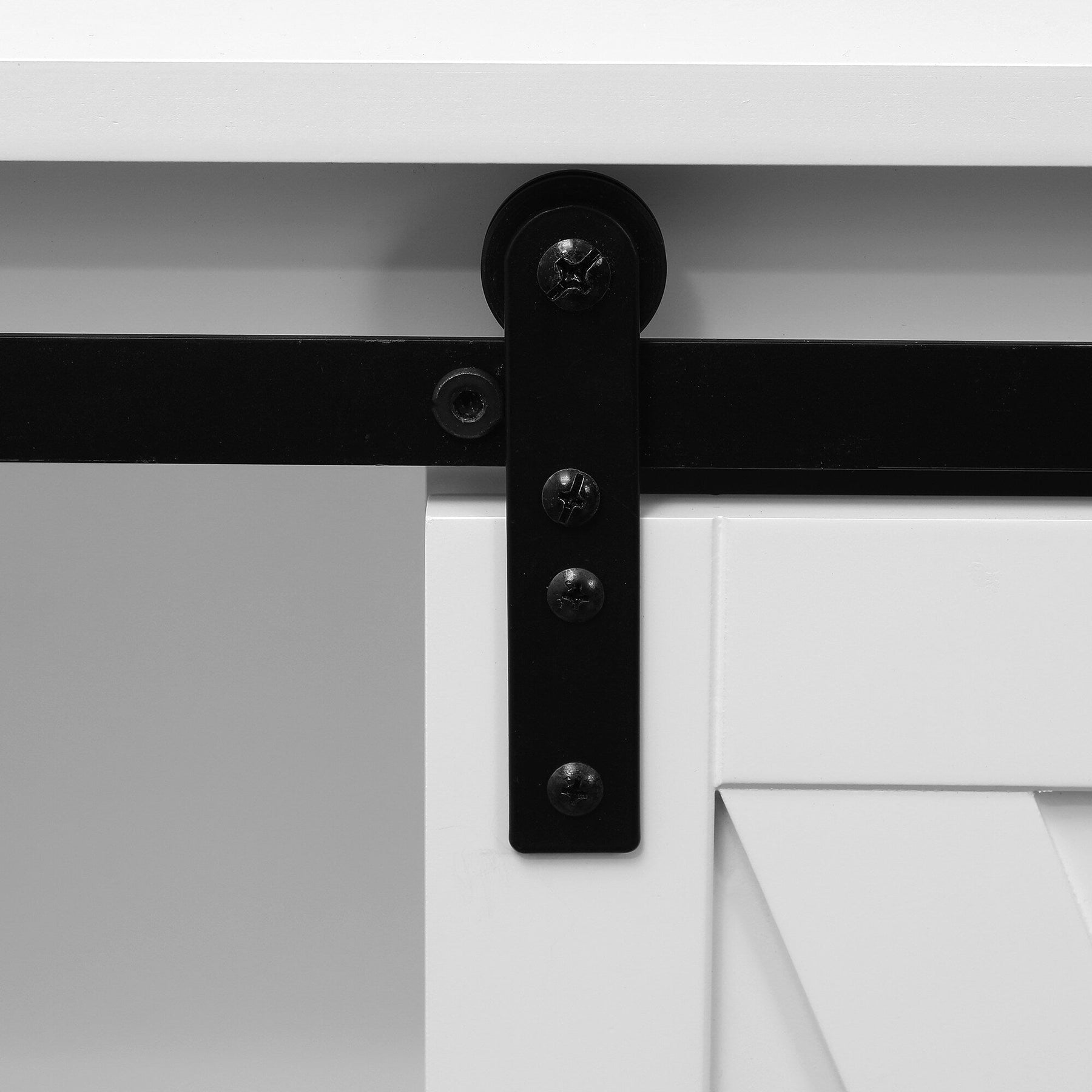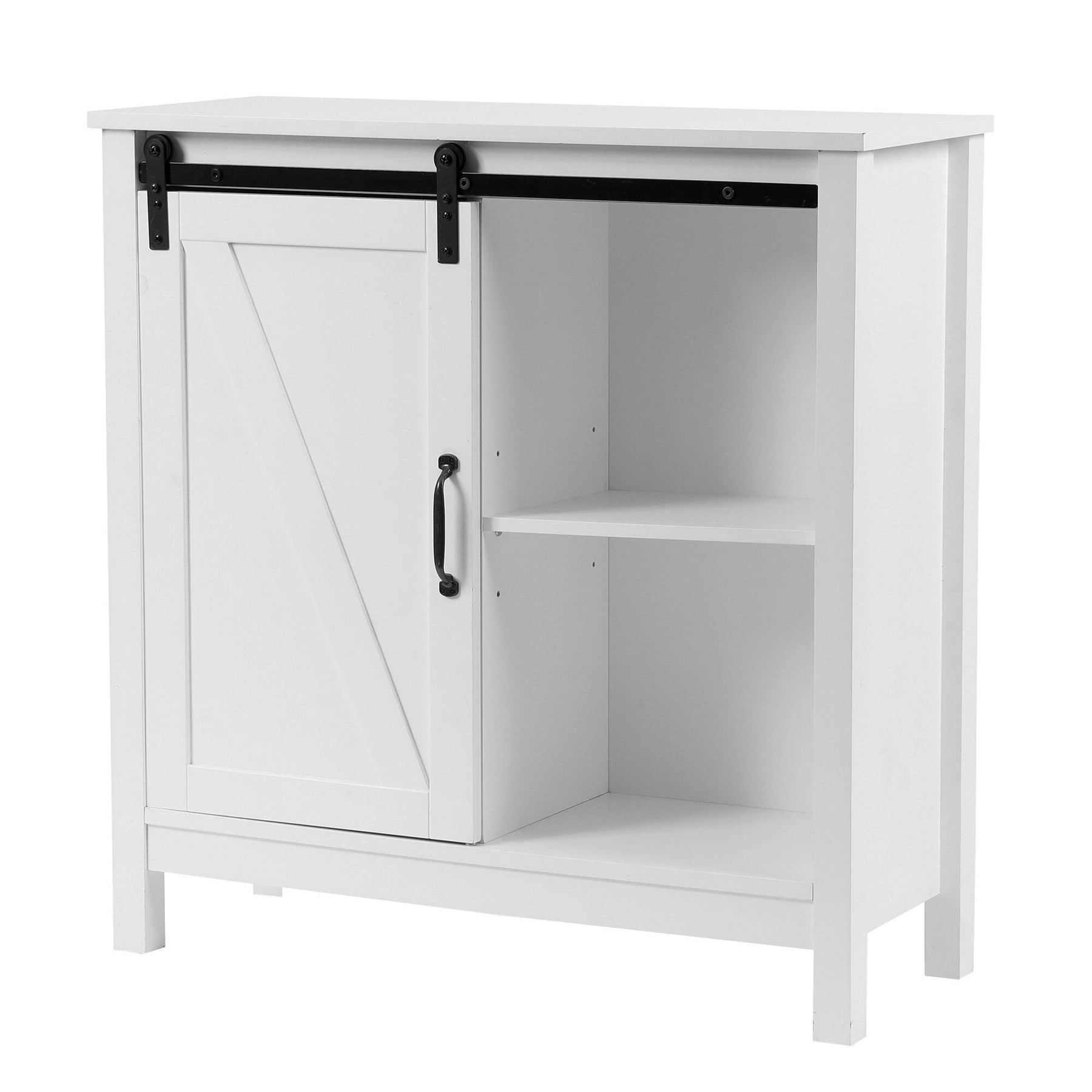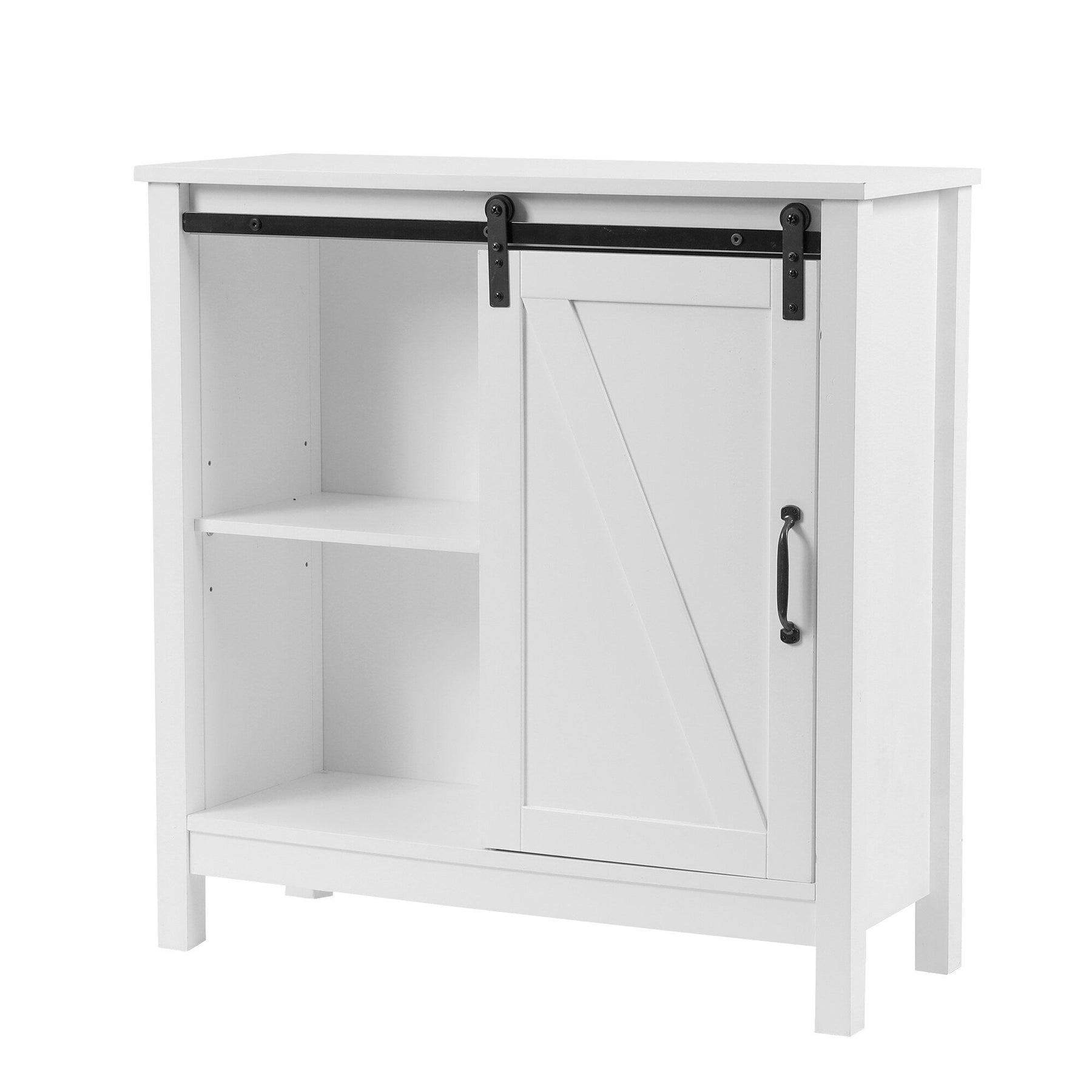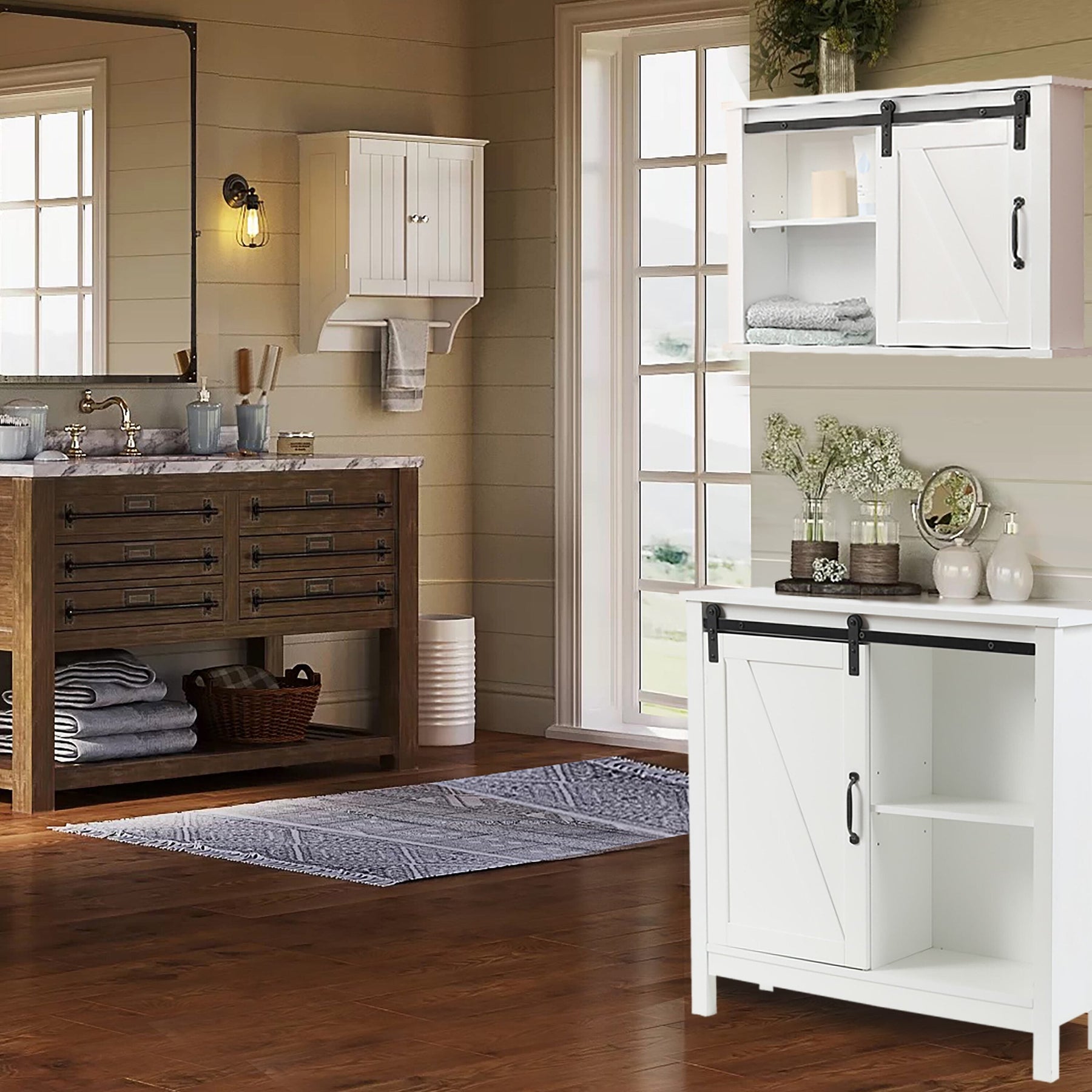 • Sliding Barn Door: Unique barn door slides to reveal storage on either side, blending function with farmhouse aesthetics.