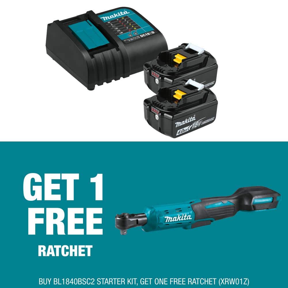 Makita 18V LXT Lithium-Ion Battery and Charger Starter Pack (4.0Ah) with bonus 18V LXT 3/8/1/4 in. Sq. Drive Ratchet