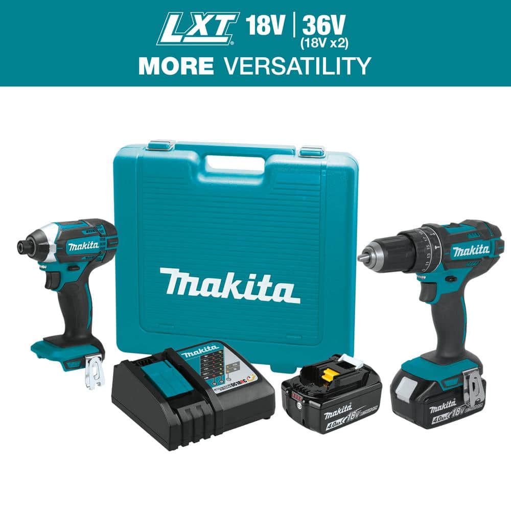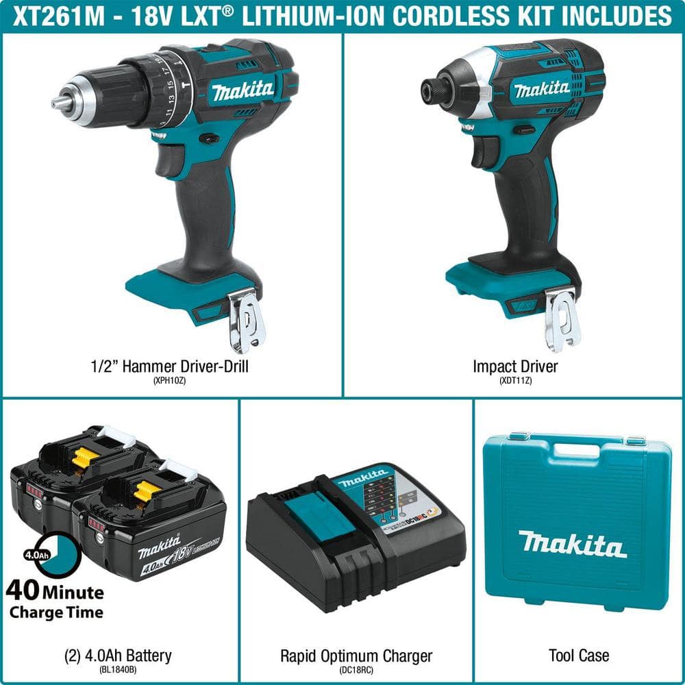 Q: What tools are included? A: A 1/2 in. hammer driver‑drill (XPH10Z), an impact driver (XDT11Z), two 4.0Ah batteries (BL1840B), rapid charger (DC18RC), and a plastic tool case.