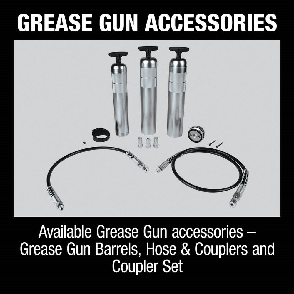 Q: What maintenance is required for the grease gun? A: Regularly clean the grease gun, check the hose and fittings for leaks, and ensure the air bleed valve is functioning to maintain optimal performance.