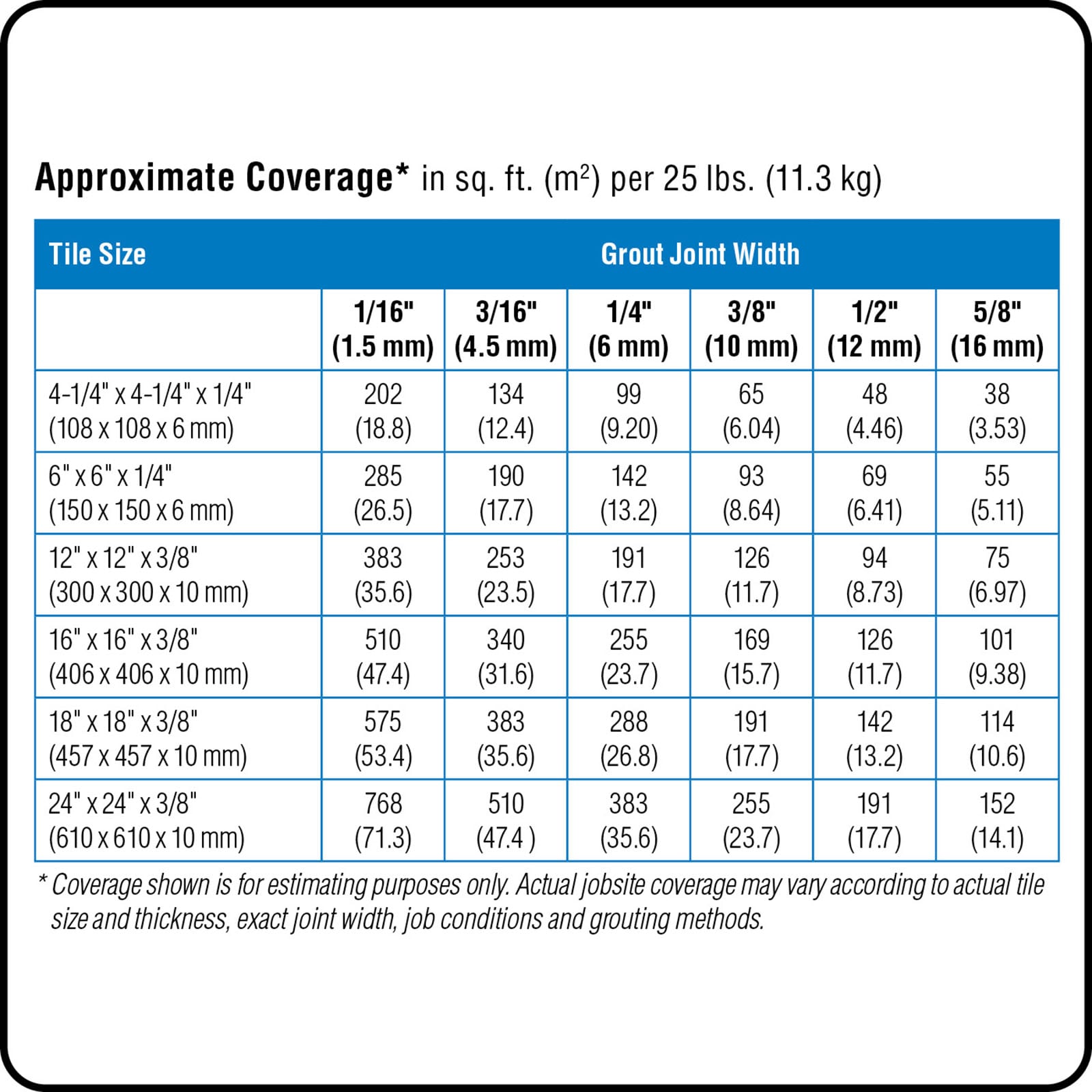 | Grout Joint Width | 1/8 in to 5/8 in |