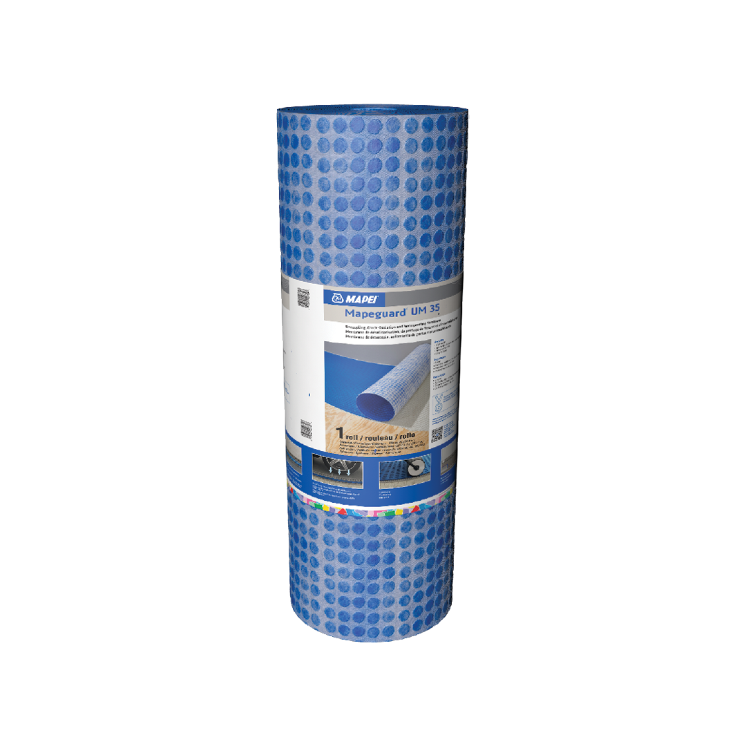 Mapeguard UM 35 is a high-density polyethylene (HDPE) uncoupling membrane with a polypropylene fabric backing designed for installing ceramic and stone tile. It provides crack isolation, waterproofing, and vapor management over challenging substrates like young concrete and single-layer plywood subfloors.