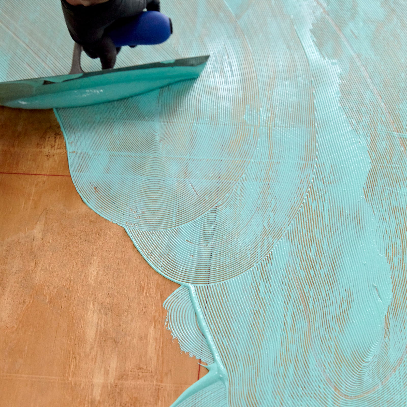 A: Trowel the adhesive to achieve an even coat and allow it to develop a pressure-sensitive tack before setting tiles, per the Technical Data Sheet.