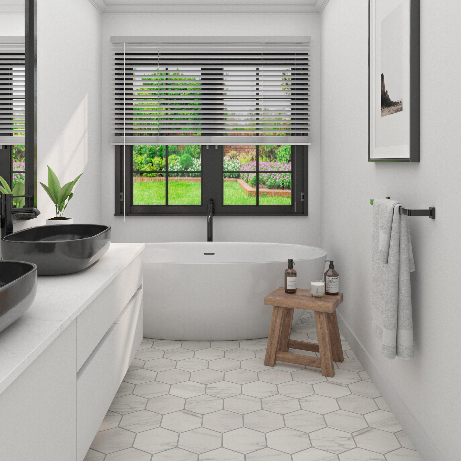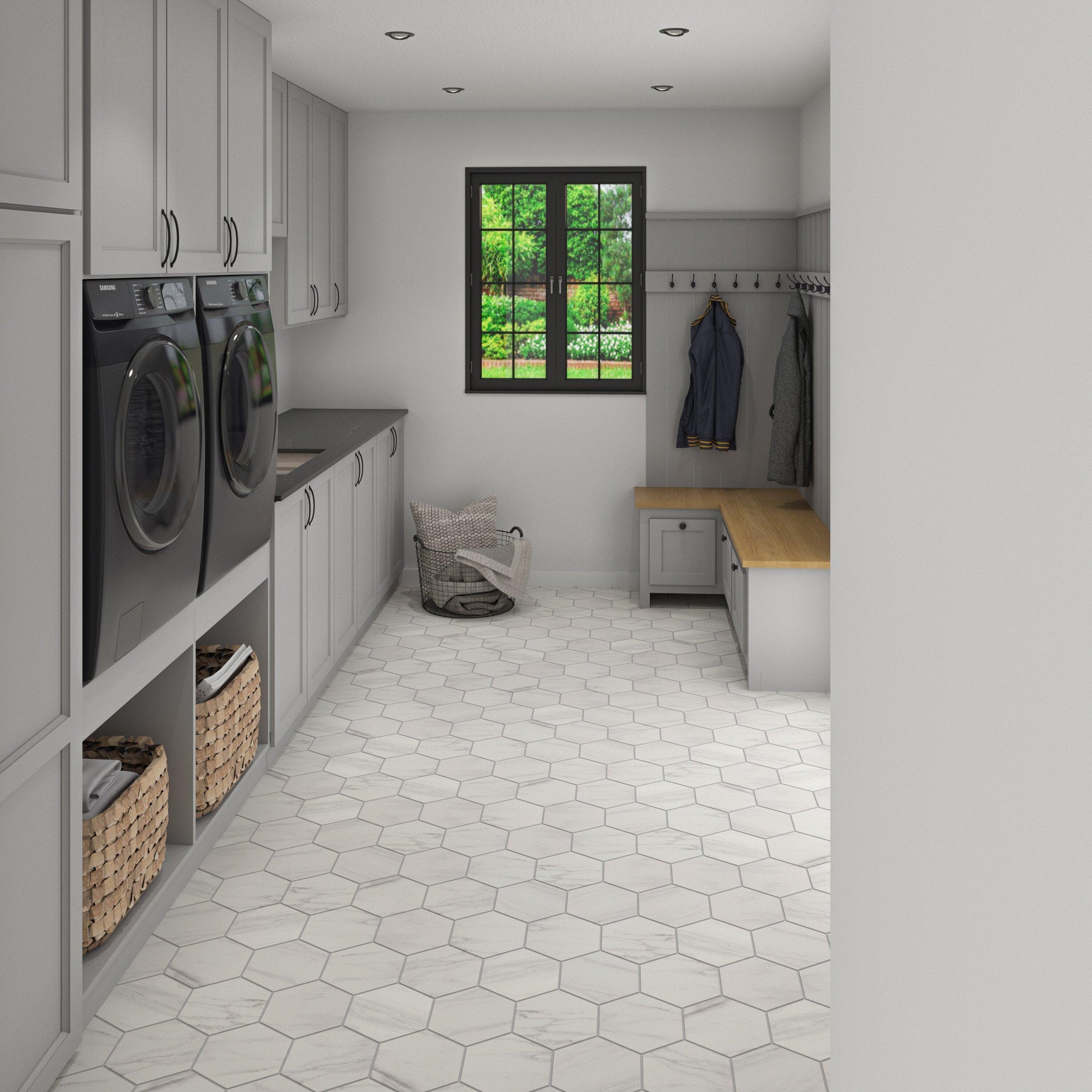 A white, stone-look hexagon porcelain tile with a soft matte finish designed for floors and walls. Durable, water-resistant, and easy to clean, it brings modern geometry and marble-inspired veining to bathrooms, mudrooms, and kitchens.