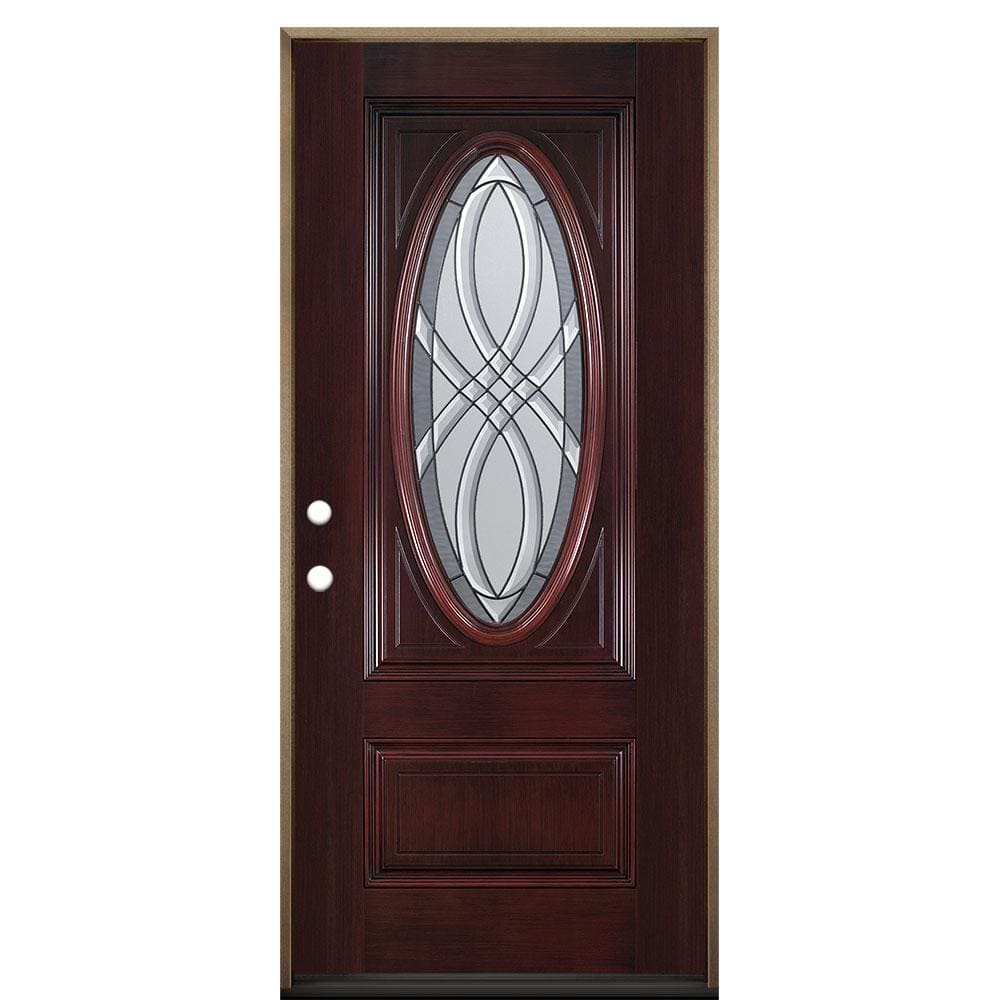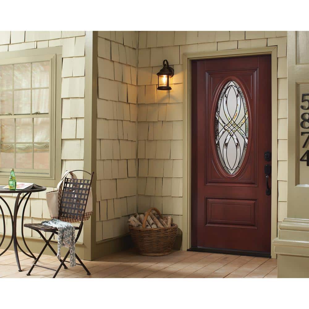 A prefinished smooth fiberglass front door that blends authentic cherry wood appearance with the durability of fiberglass. Features a 3/4 oval decorative glass lite, triple-pane insulation, and comes prehung with frame, hinges, sill, and weatherstripping for easy installation.