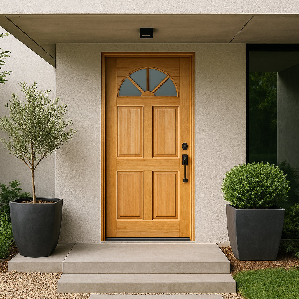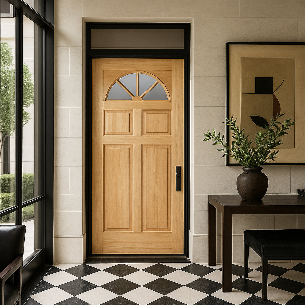 Channeling the warmth and authenticity of natural materials, this Masonite Fan Lite door transforms any entryway into a welcoming focal point. The elegant fan-shaped glass detail not only invites sunlight but also adds a touch of architectural grace. Style it with bold hardware and lush greenery to create a grand entrance that feels both classic and fresh. This door is the epitome of refined living—where craftsmanship meets customizable beauty, making it an essential for those who value both form and function.