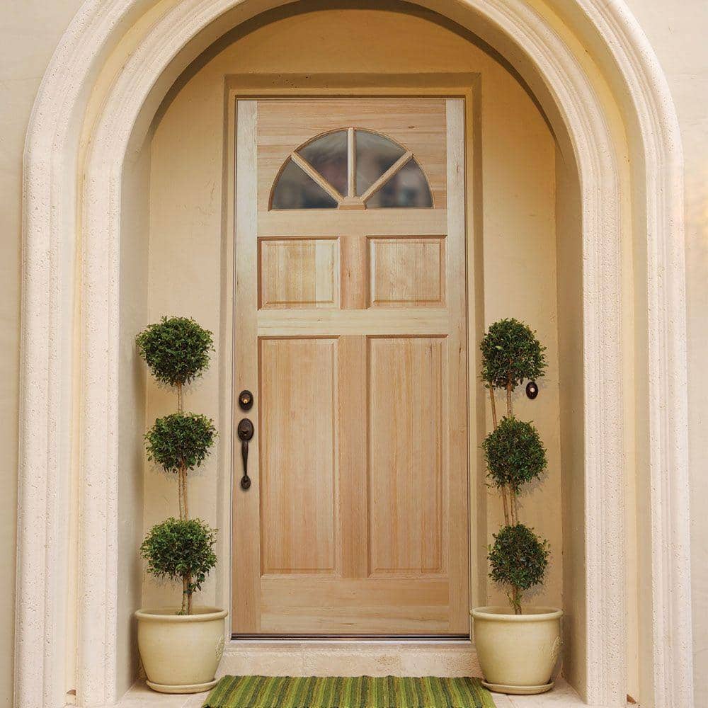 The Masonite 36 in. x 80 in. Fan Lite Unfinished Fir Front Exterior Door Slab brings timeless style and natural light to your entryway. Crafted from responsibly sourced fir wood, this door features a clear tempered glass fan lite and a sturdy, warp-resistant construction. Its unfinished surface allows for complete customization to match your home's unique aesthetic.