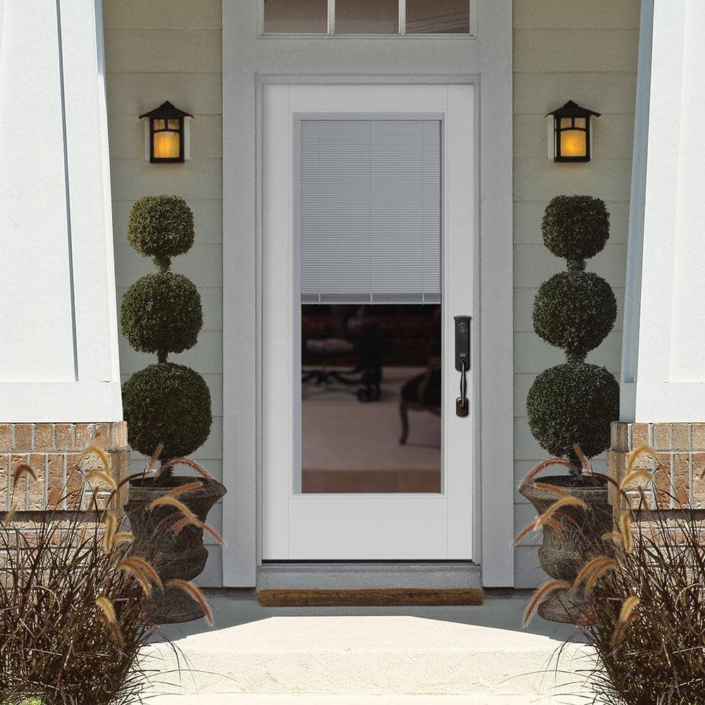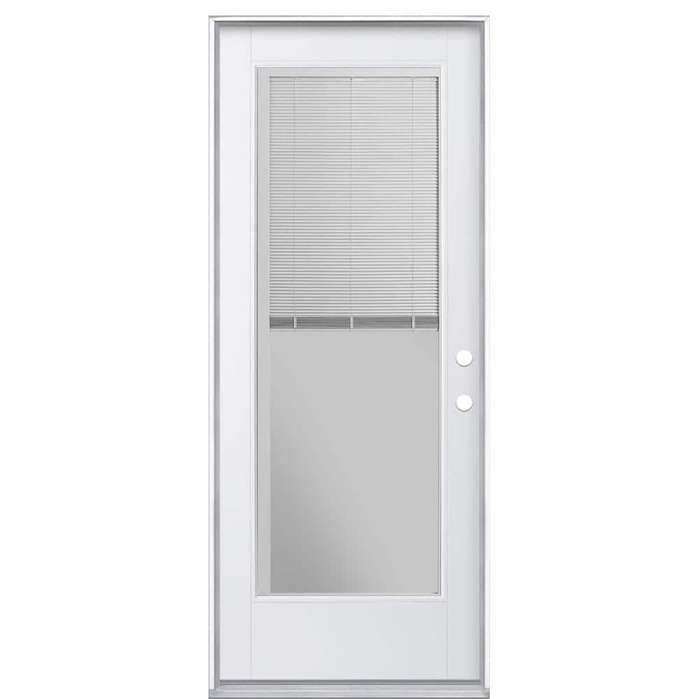 The Masonite VistaGrande 32x80 Left Hand Inswing Full Lite Mini Blind Fiberglass Prehung Exterior Door brings modern style and abundant natural light to your entryway. Its flush-glazed clear glass with internal mini blinds offers privacy and versatility, while the durable fiberglass construction and energy-saving polyurethane core ensure long-lasting performance and protection. Primed and ready for painting, this door is engineered for easy installation and exceptional weather resistance.