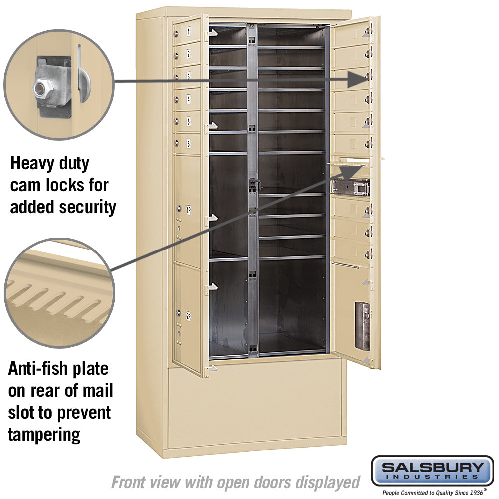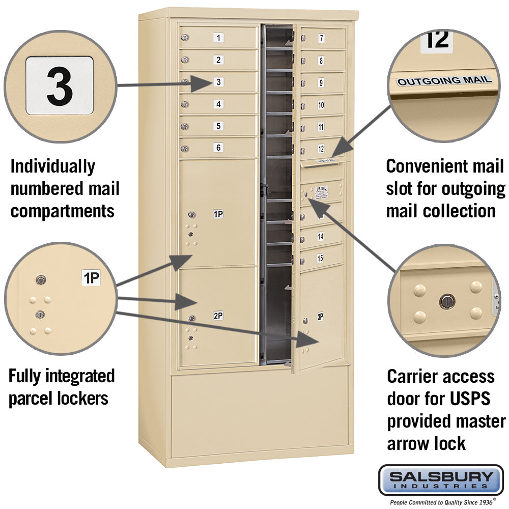 Maximum Height Free-Standing 4C Horizontal Mailbox with 15 Doors and 3 Parcel Lockers in Sandstone