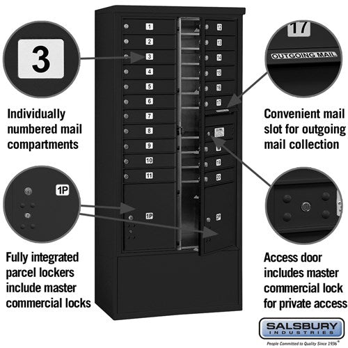 Maximum Height Free-Standing 4C Horizontal Mailbox with 20 Doors and 2 Parcel Lockers in Black with Private Access