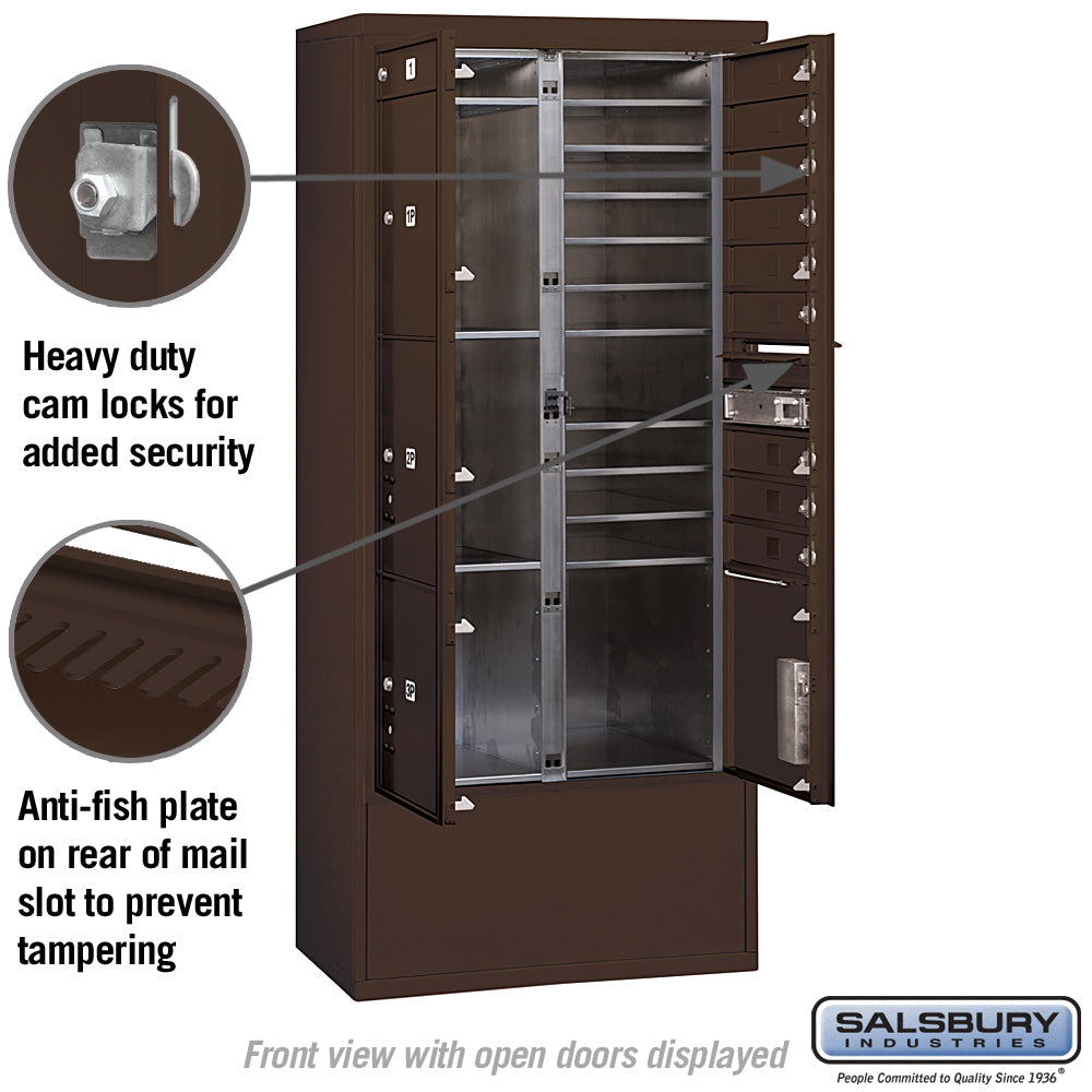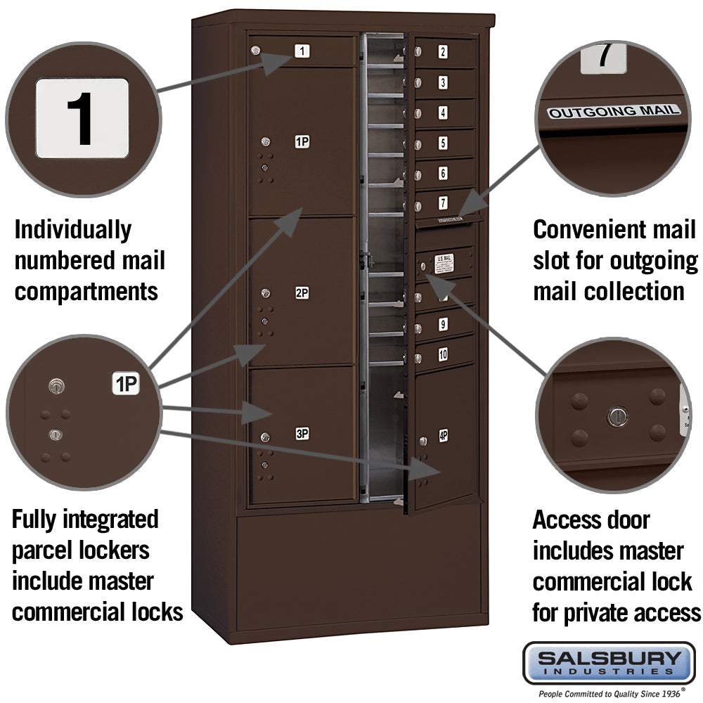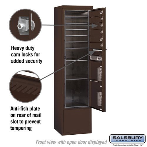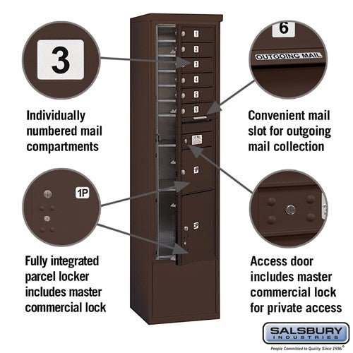 This free-standing mailbox unit combines functionality and durability with a sleek bronze finish. Featuring 6 mail compartments and 2 parcel lockers, it is ideal for private access in indoor or outdoor settings.