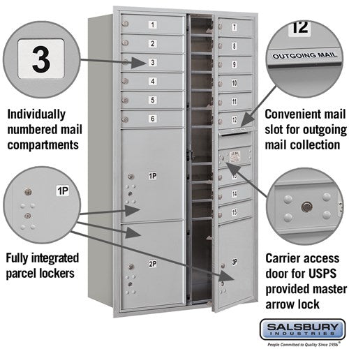 This recessed mounted mailbox offers maximum height with 15 doors and 3 parcel lockers, designed for USPS access and front loading. Constructed from heavy-duty aluminum with a durable powder-coated finish, it ensures security and compliance with USPS standards.