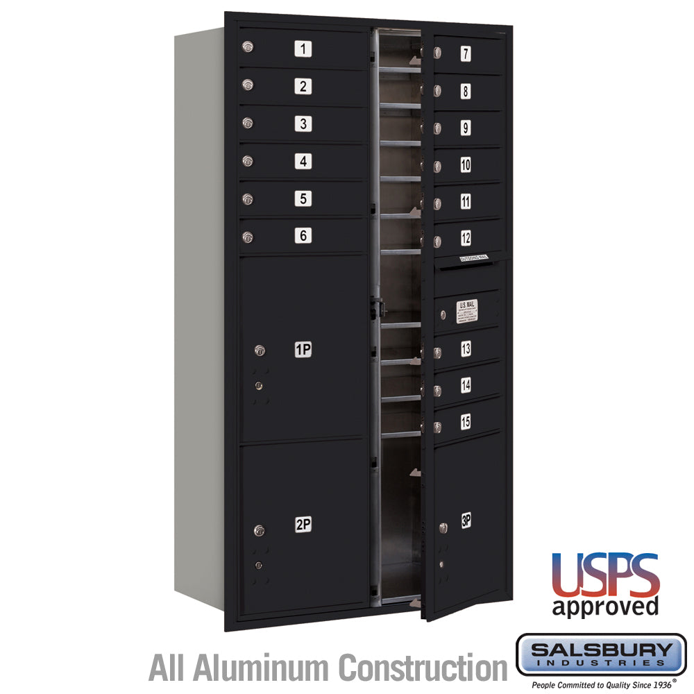 This recessed mounted mailbox offers maximum height with 15 doors and 3 parcel lockers, designed for USPS access and front loading. Constructed with heavy-duty aluminum and stainless steel hardware, it is ideal for residential and commercial use.