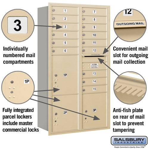 A: This mailbox features 15 mail compartments and 3 parcel lockers.