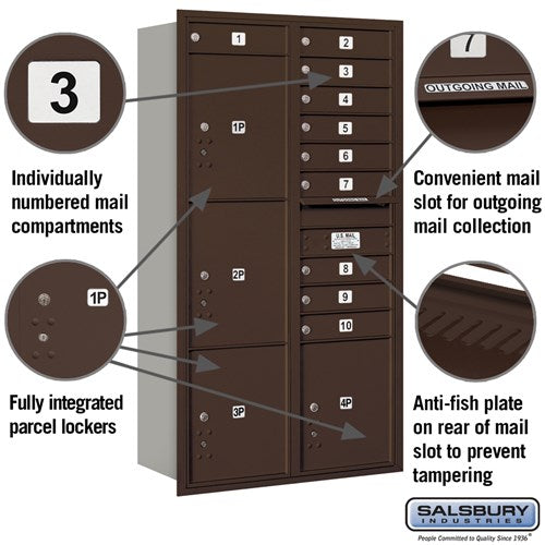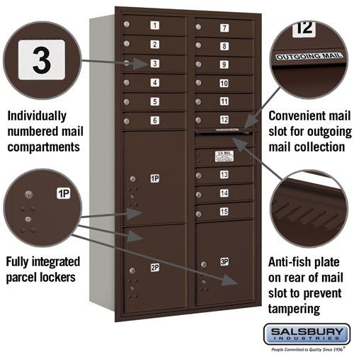 This recessed mounted 4C horizontal mailbox offers maximum height with 15 doors and 3 parcel lockers, designed for USPS access and rear loading. Constructed from heavy-duty aluminum with a durable bronze powder-coated finish, it ensures security and compliance for residential or commercial use.