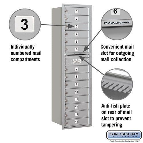 This recessed mounted mailbox offers private access with 14 doors, constructed from heavy-duty aluminum and stainless steel hardware. Ideal for secure mail storage in schools, corporate centers, and other private settings.