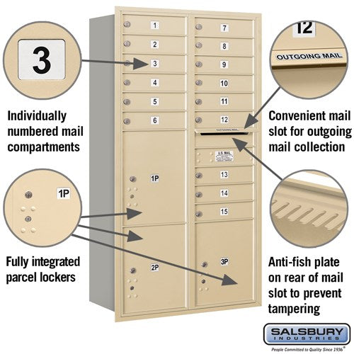 This recessed mounted mailbox offers maximum height with 15 doors and 3 parcel lockers, designed for USPS access and rear loading. Constructed from heavy-duty aluminum with a durable sandstone finish, it ensures security and compliance with USPS standards.